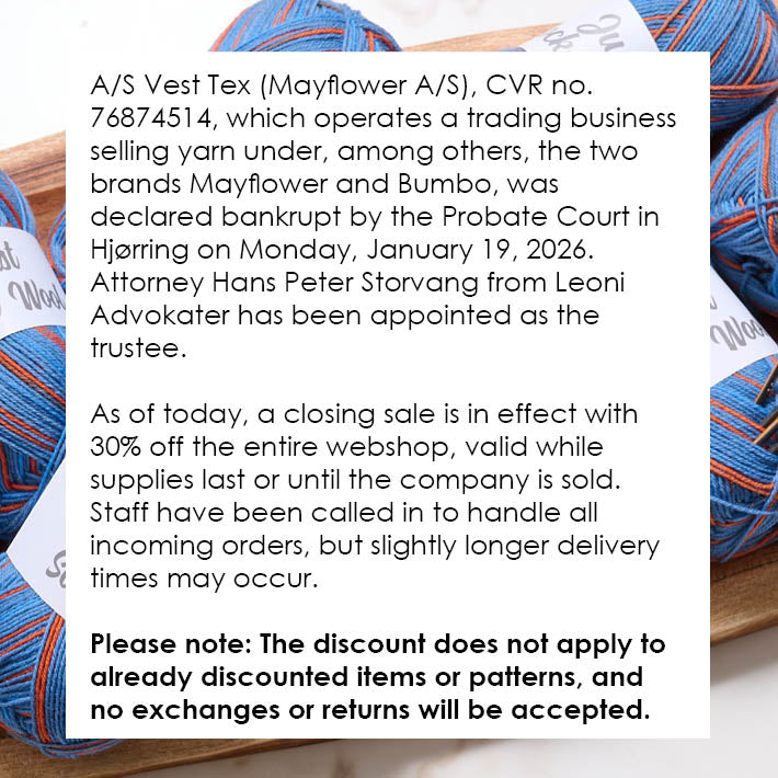 In Mayflower's assortment, there are yarn qualities for all types of clothing - from the warm hat to the woolen socks and the lovely knitted sweater. The large universe of patterns is steadily growing and consists of a good mix of timeless classics, current knitting trends, and delightful retro patterns.