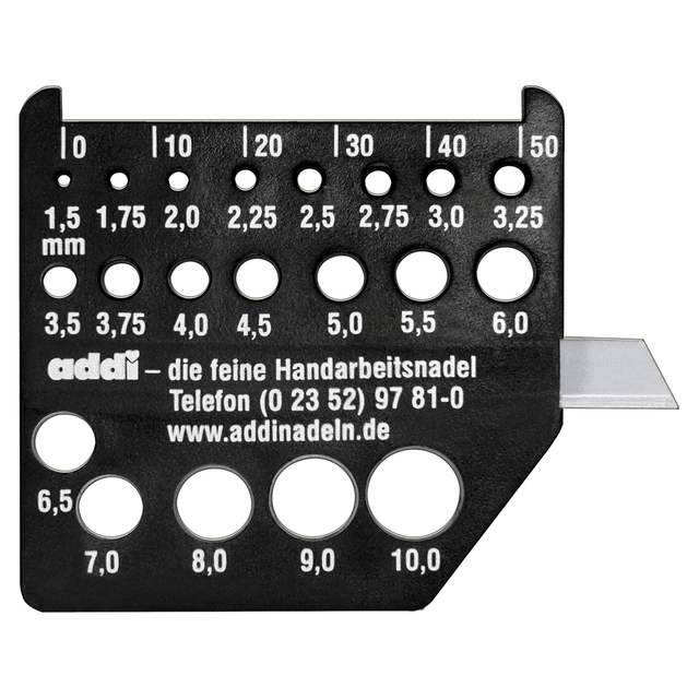 Small and handy gauge for knitting needles from 1.5 to 10 mm with a small sharp knife to cut threads.