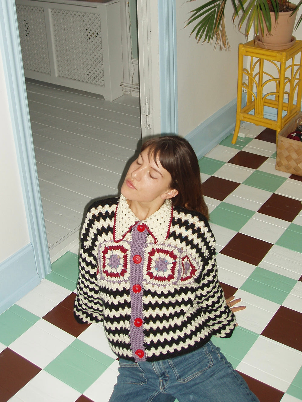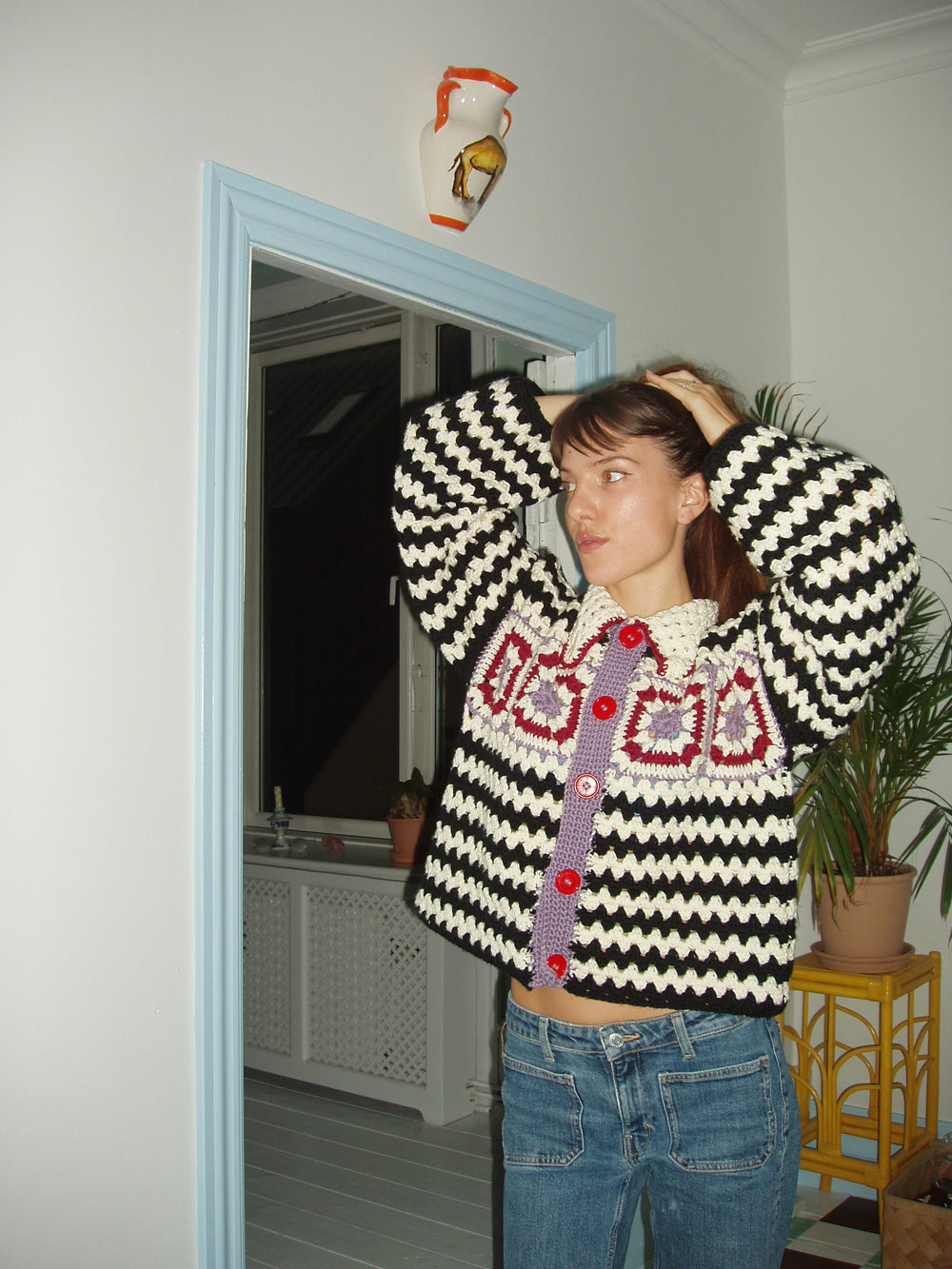 Crocheted with the classic “granny stripes” which are simple and quick to crochet but give an exciting and old school expression. The cardigan is finished with a nice collar and large buttons.