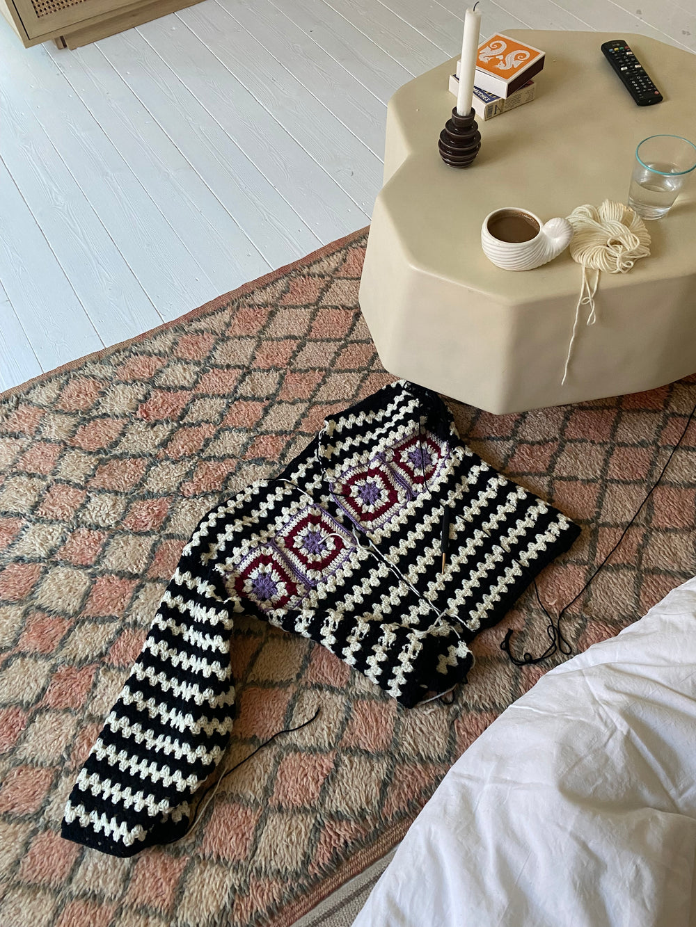 Crocheted with the classic “granny stripes” which are simple and quick to crochet but give an exciting and old school expression. The cardigan is finished with a nice collar and large buttons.
