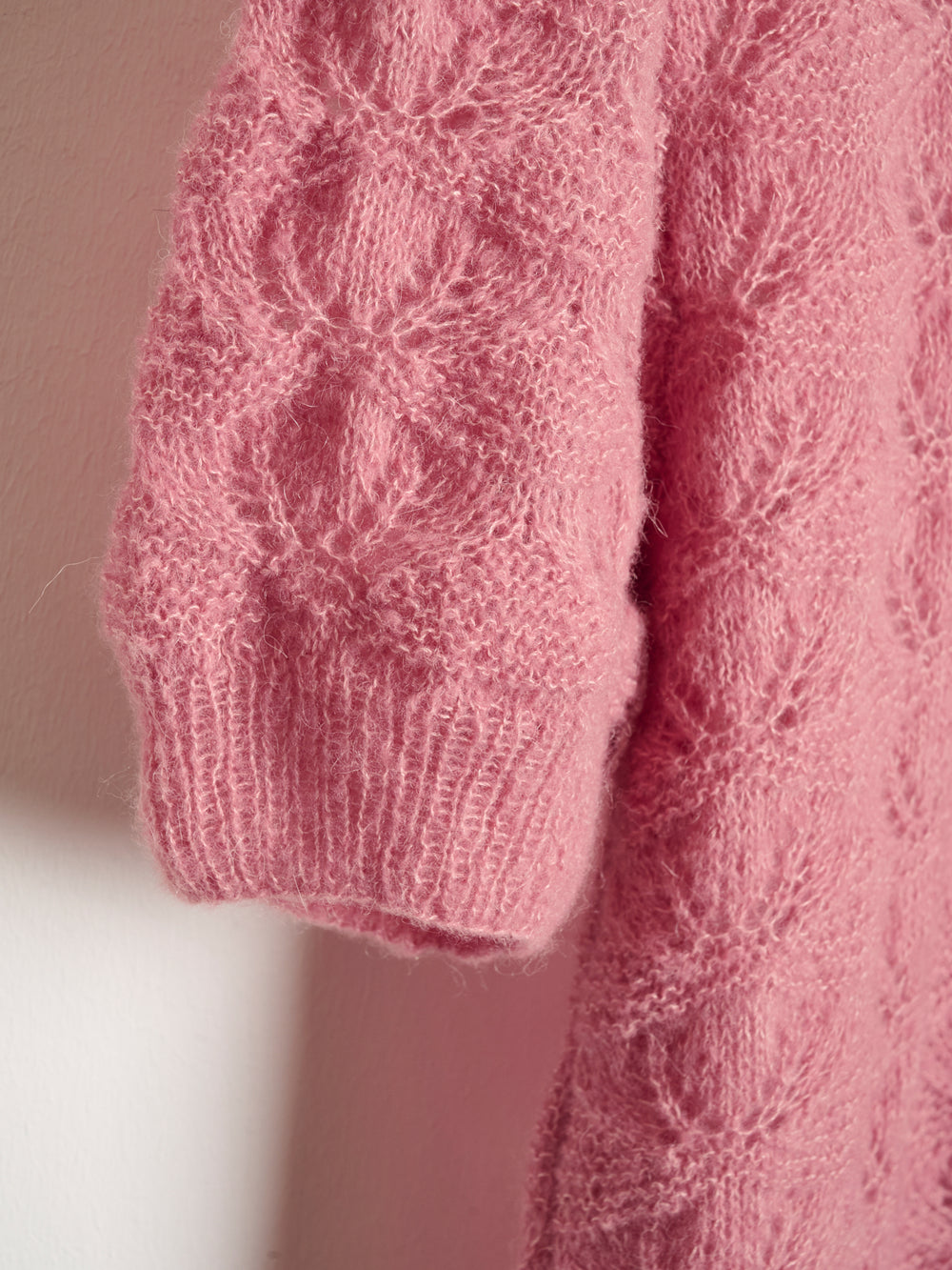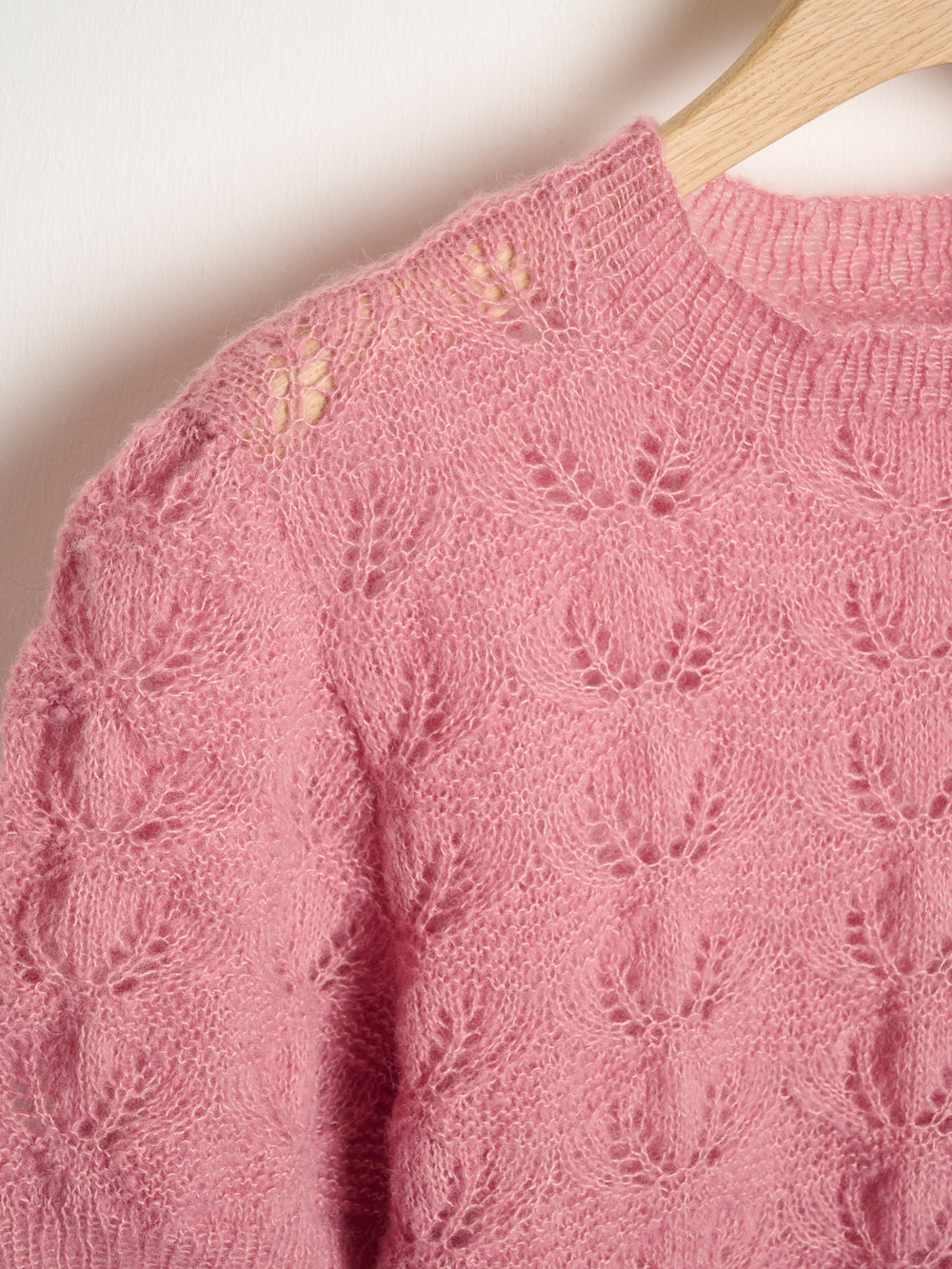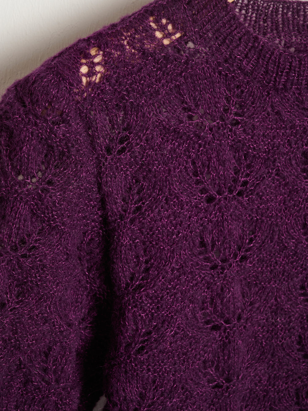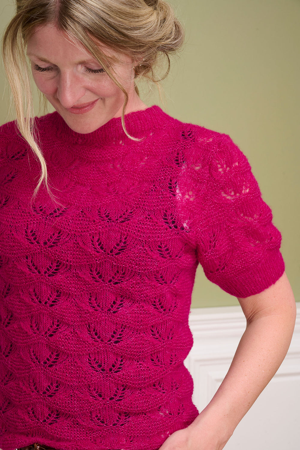 The lovely Mayflower Premium Cassandra yarn gives the design its light and airy feel. Spun from alpaca, silk, and wool, Cassandra is an incredibly soft and luxurious yarn that elevates the design and makes the blouse truly comfortable to wear.