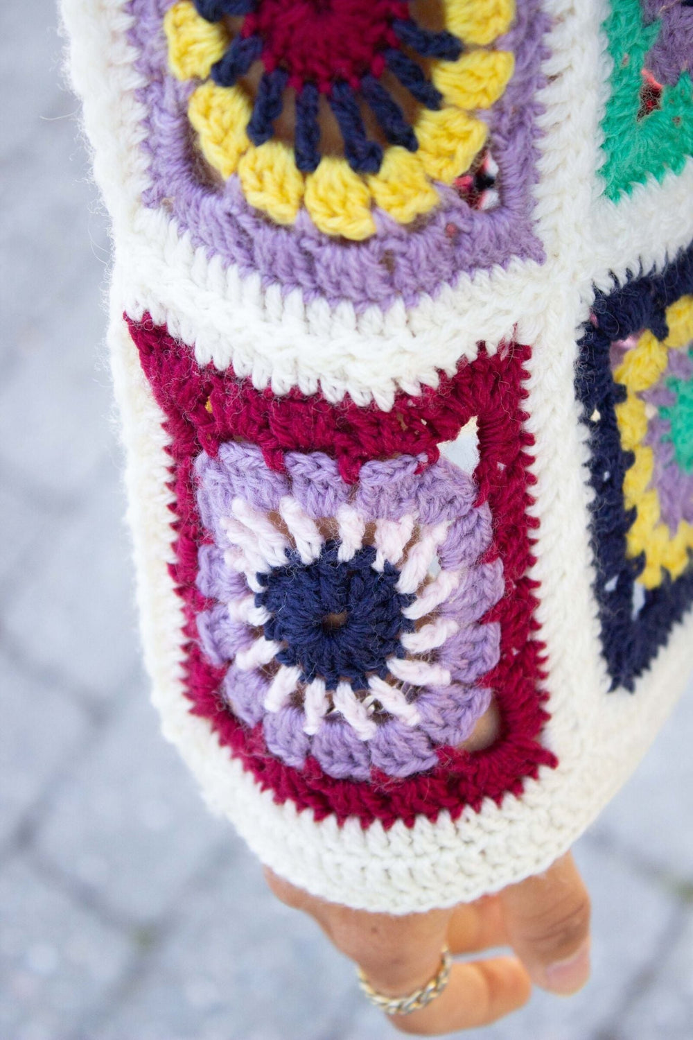 For this cardigan, you can play with exactly the color combinations you want. Each granny square consists of several rows, where you can advantageously change color in each row. If you use the same color in each row in all squares, you get a more monochrome look, and if you randomly switch between colors in each row, like in this model, you get a more vibrant expression. You therefore decide entirely what expression your Angelina cardigan should have.
