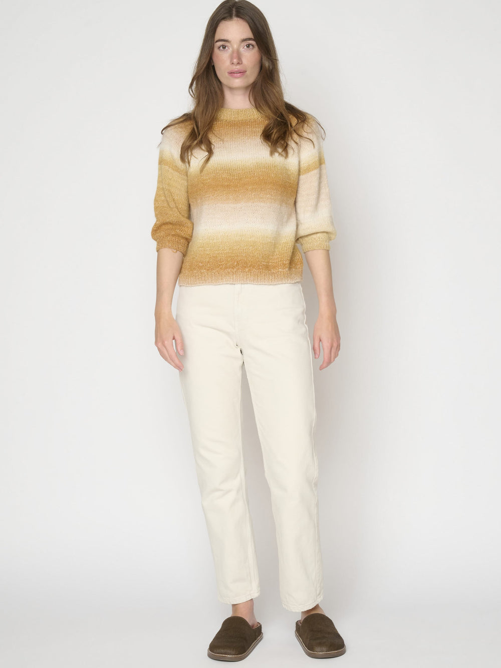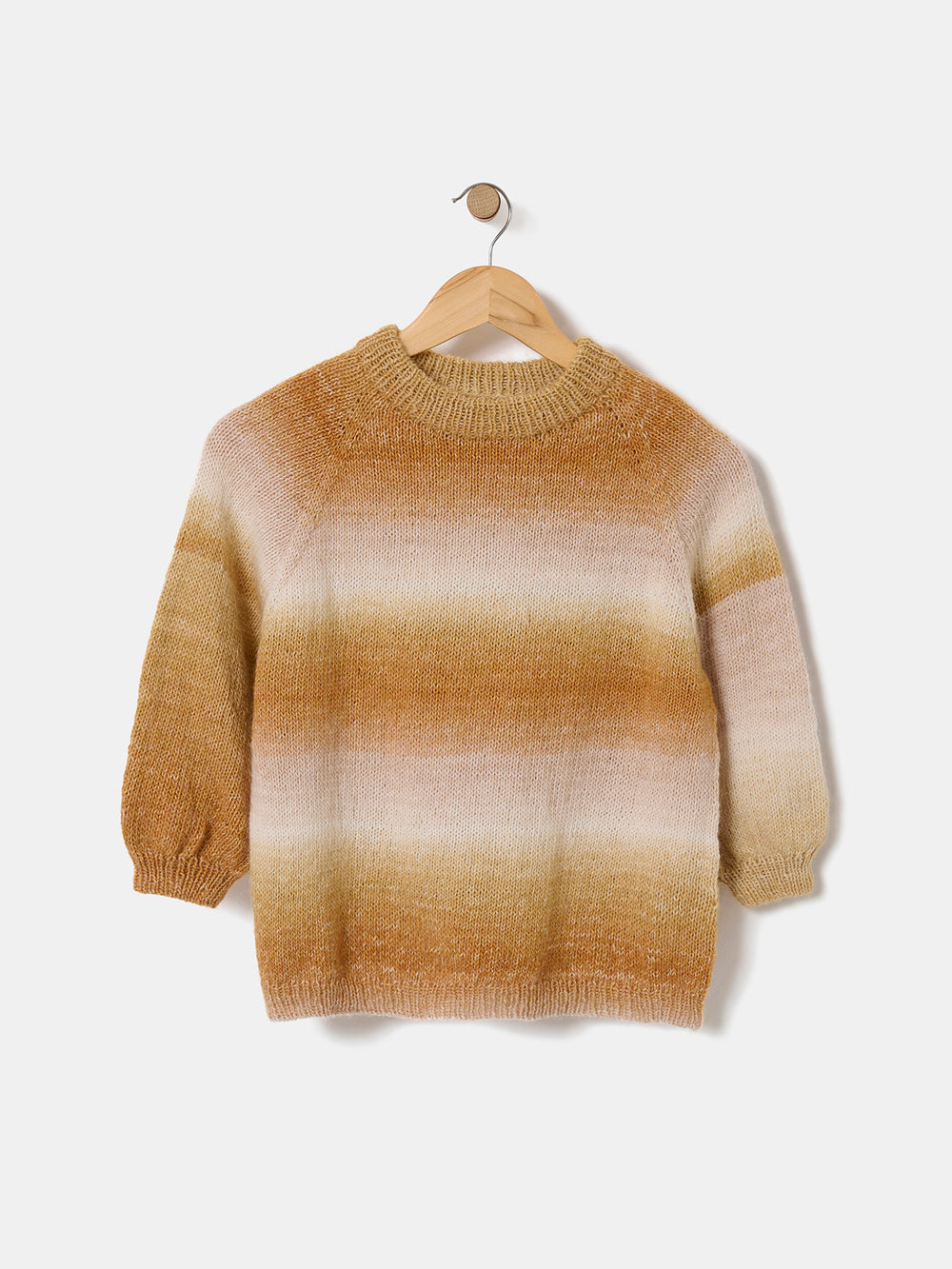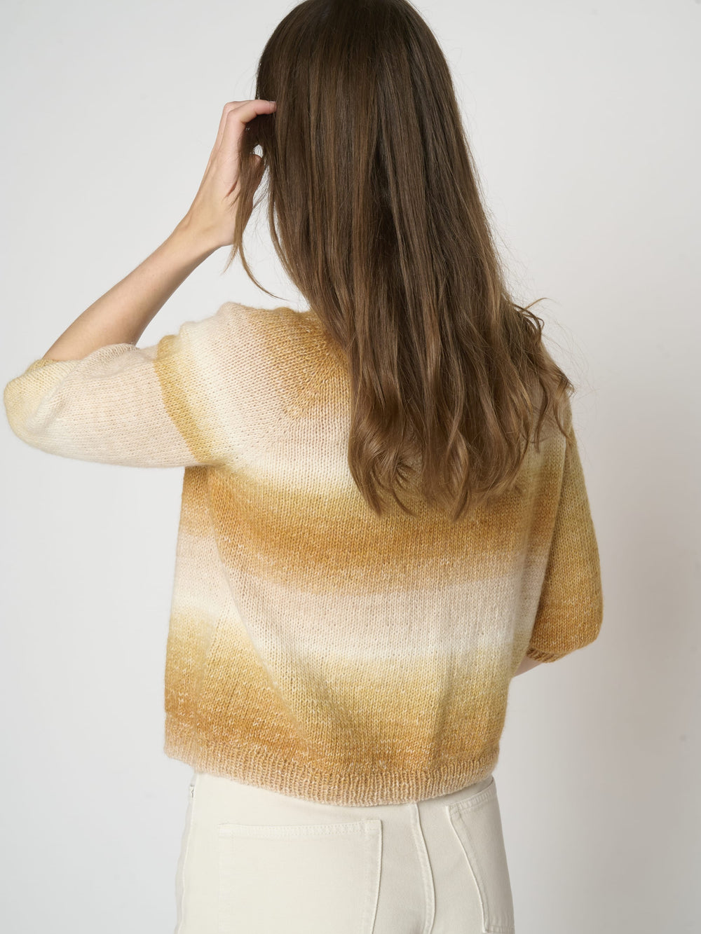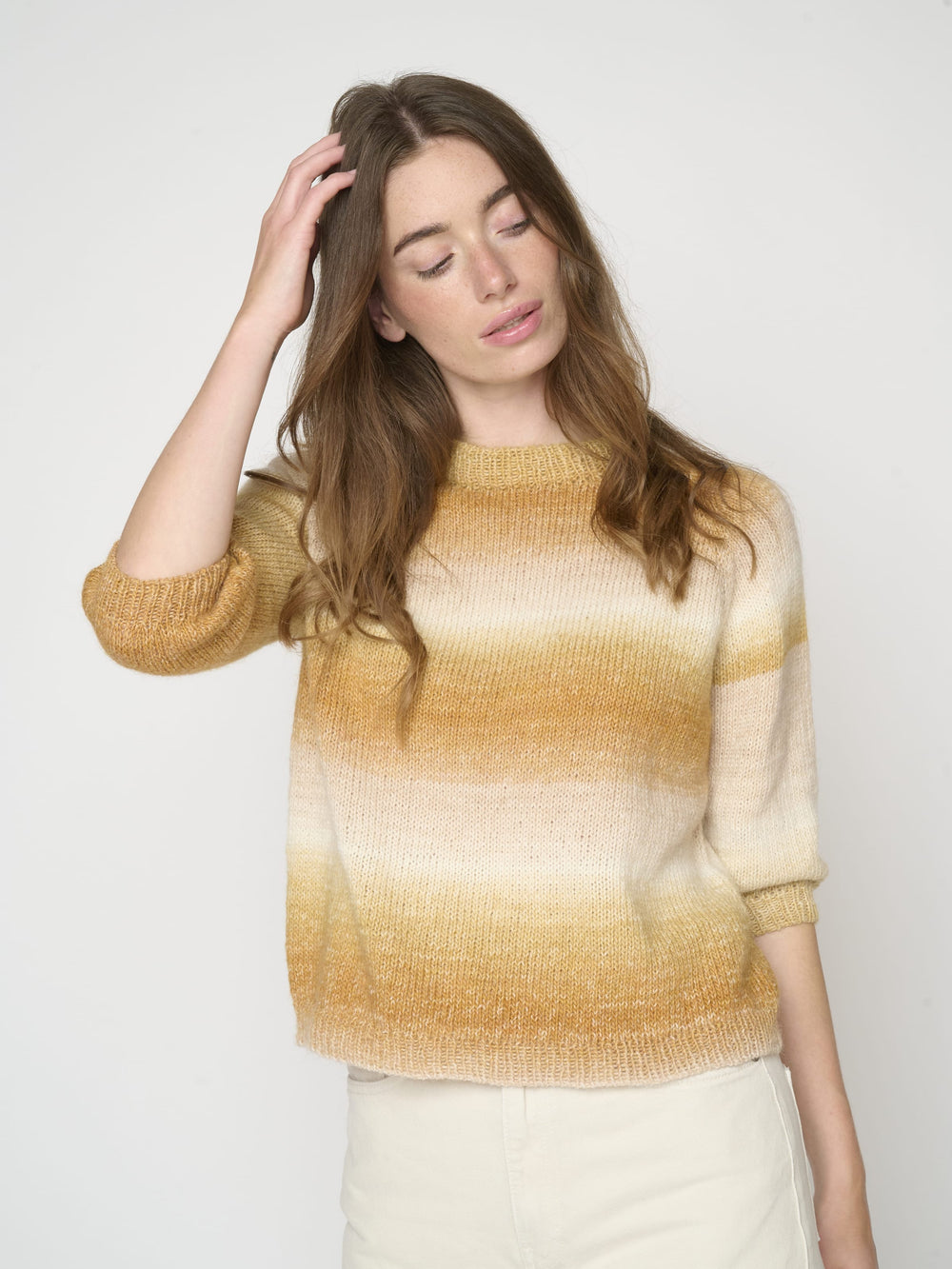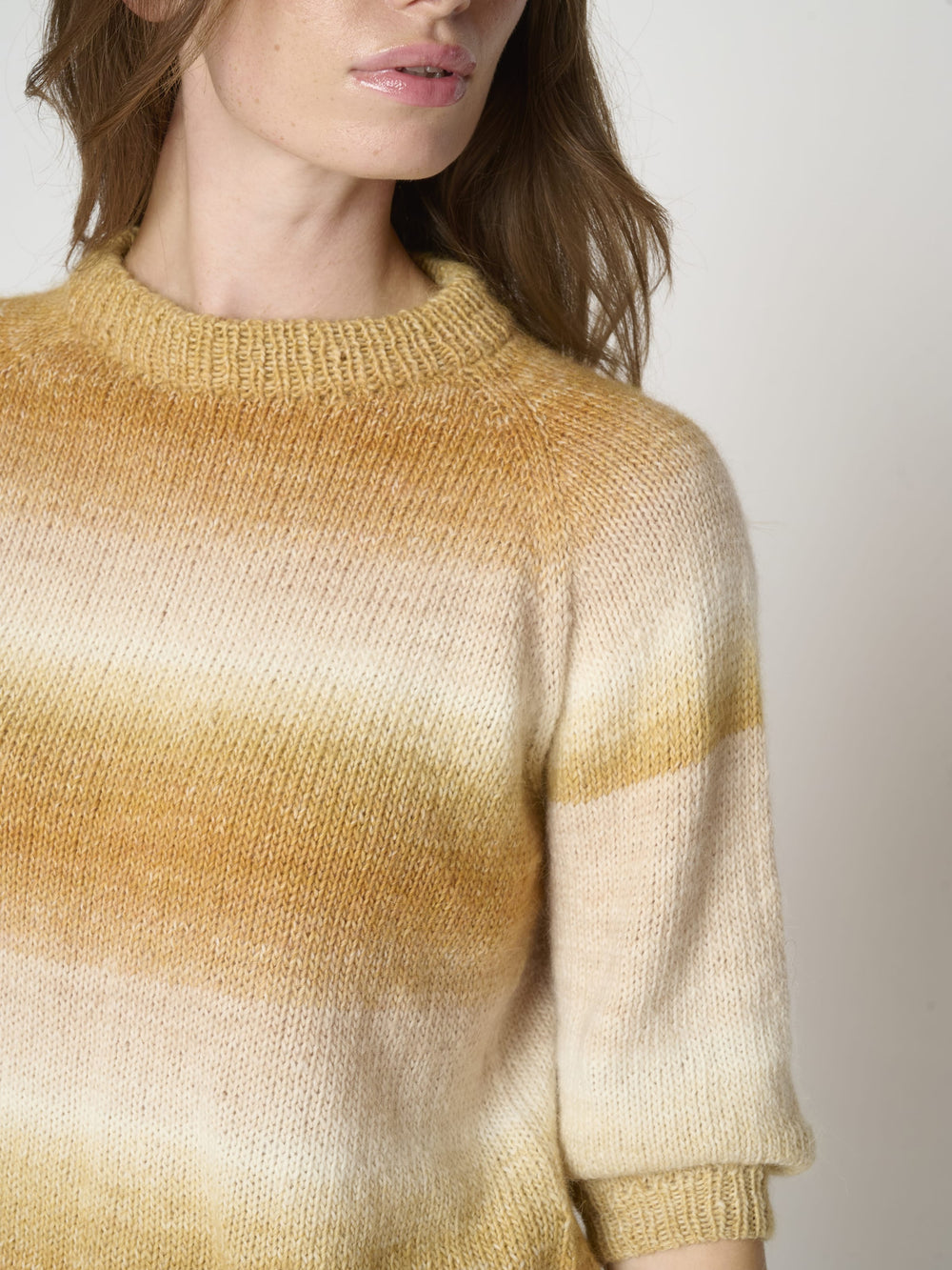 The blouse's beautiful color transition happens naturally as the blouse is knitted in Mayflower Taormina Flow, which has the finest color gradient in graduating shades. The yarn is a soft alpaca blend with the same fiber composition as Taormina and Taormina Shade.