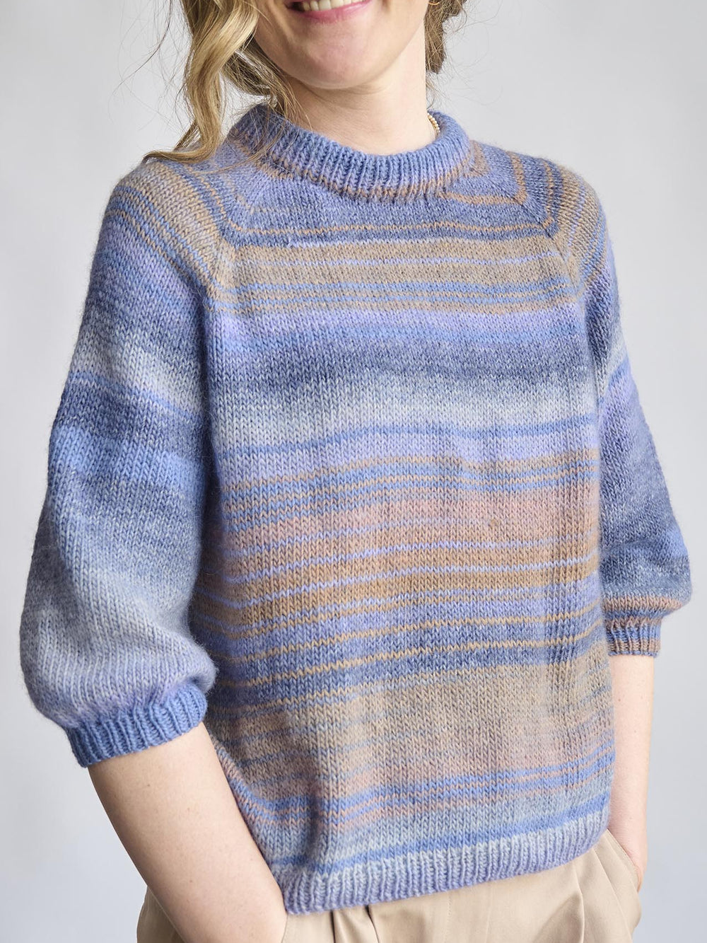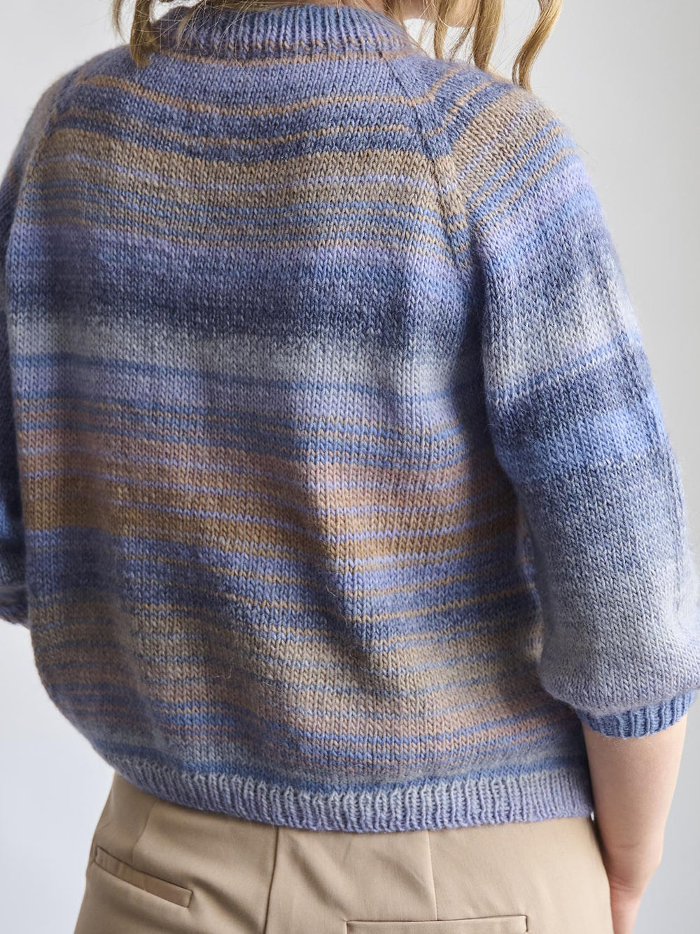 The Anita blouse is wonderfully simple to knit, and it is a great option for a beginner-friendly knitted blouse. The blouse is knitted in the beautiful Mayflower Taormina, which has the most beautiful color transitions. It is knitted top-down with raglan increases on the sleeves and is designed with a bit of extra width for optimal freedom of movement, which is emphasized by the lovely ¾ sleeves. As an extra detail, the edges of the blouse are knitted with twisted rib, giving a nice finish.