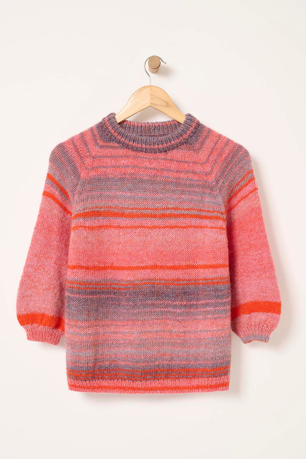 Taormina is a soft alpaca blend, but the yarn is especially remarkable because of its beautiful colors. When you knit the Anita blouse, you don't have to think about color transitions, but instead, you can enjoy how the yarn itself creates beautiful stripes.