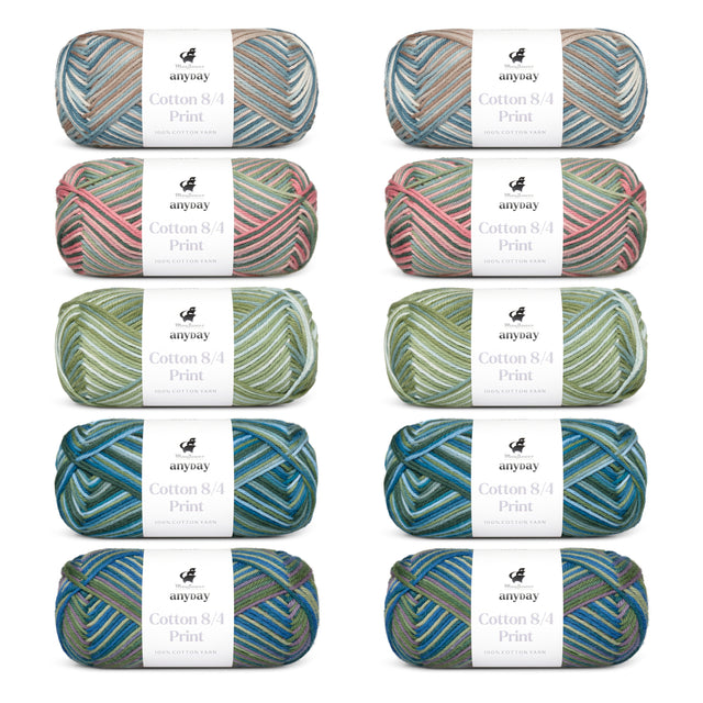 Anyday Cotton 8/4 Print is available in packs of 10 skeins, containing 2X5 skeins in five different prints.