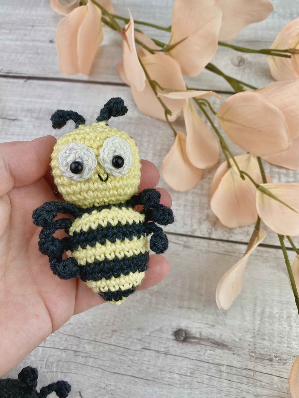 The only parts that need to be sewn on are the wings and eyes, as everything else is crocheted in one piece (body, head, legs, and antennae).