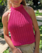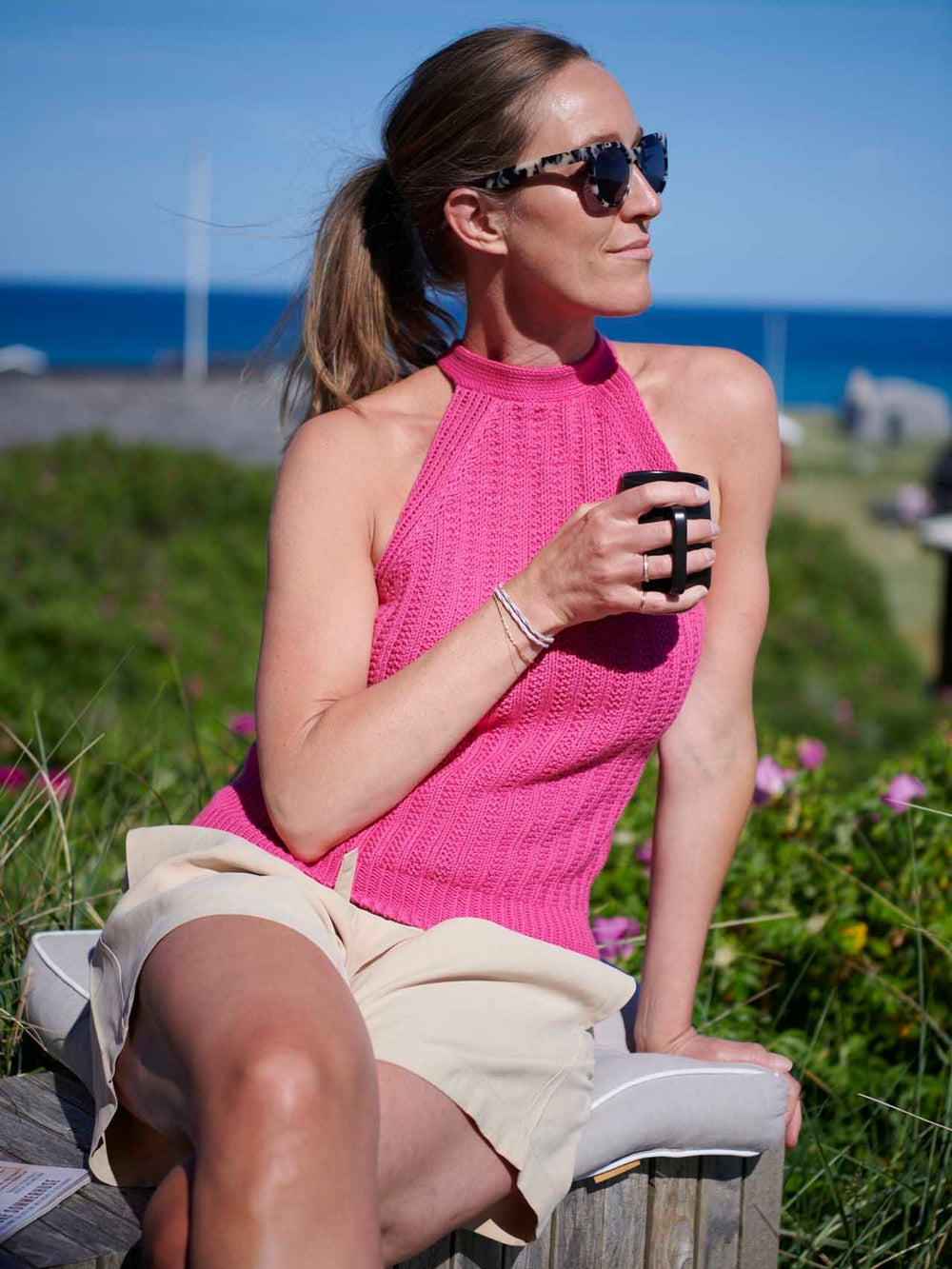 Designed with a halterneck for bare shoulders, it offers a light top with a comfortable fit, ideal for the warm summer days or, for example, under a light cardigan. The top is knitted from top to bottom and stands out with its many beautiful details.