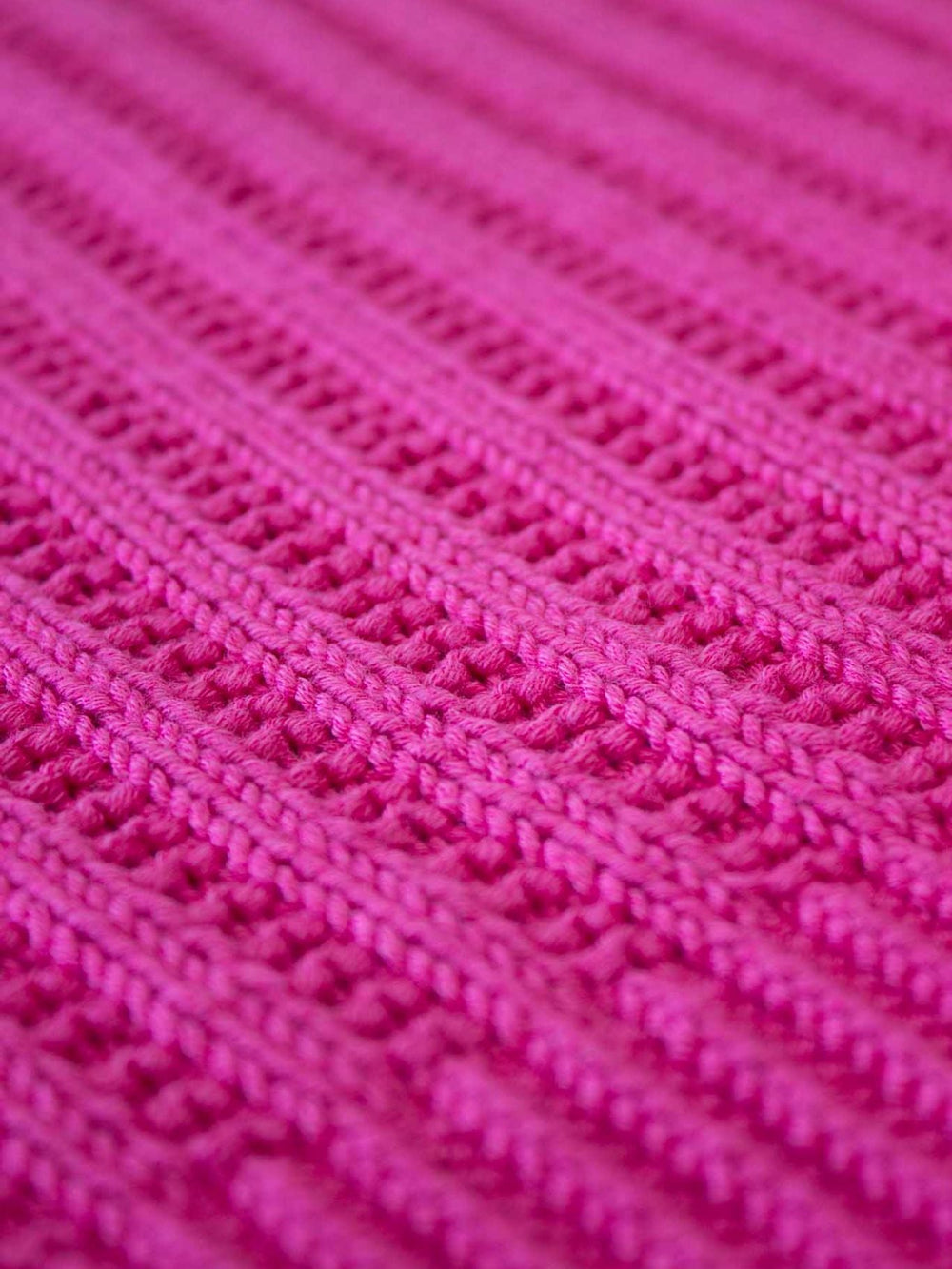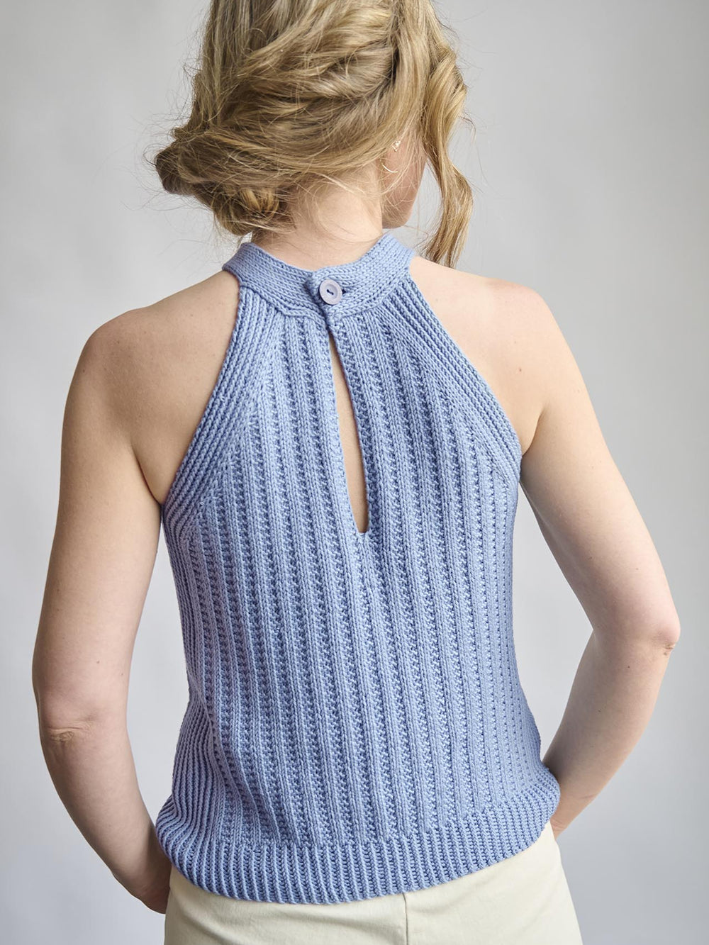 It is knitted in two rib patterns. The primary pattern consists of a beautiful broken rib, complemented by an elegant twisted rib edge. It runs from the neckline all the way down along the front and back, joins under the arms, and ends at the rib edge at the bottom of the top. The smooth knitted neckline is double and has a simple button closure at the neck.