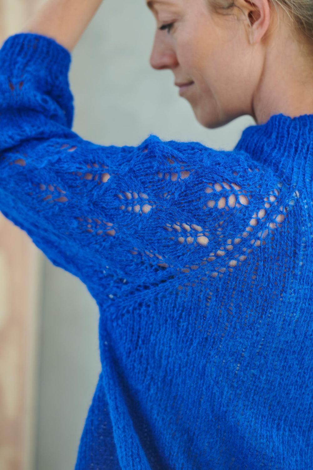 The Rønbjerg blouse is short and has a movement space of about 30 cm. However, it is easy to increase the length of both the body and sleeves along the way, as the blouse is knitted from top to bottom. The blouse has a super light and airy structure, as it is knitted with two threads Mayflower Elba. The fine yarn is soft and luxurious, and with two threads, the blouse gets extra fluff without becoming heavy.