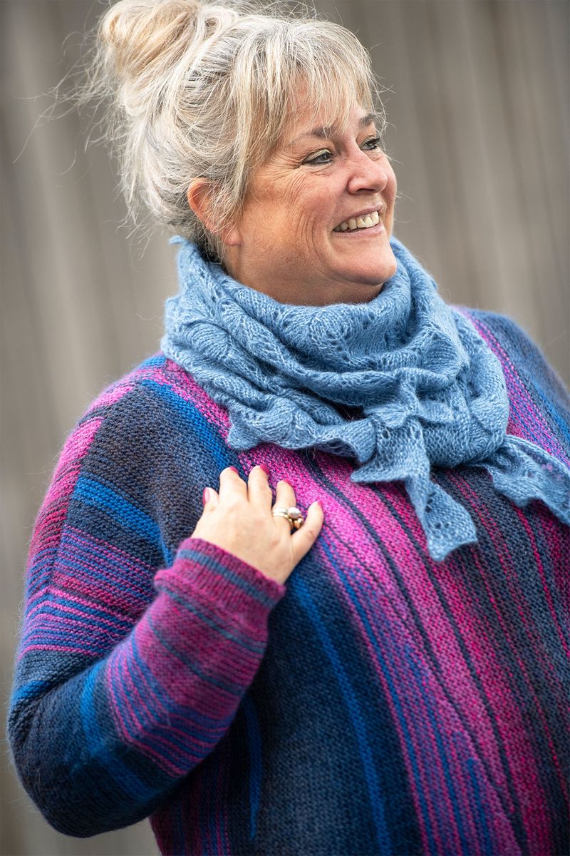 The shawl is knitted in one color, which provides a good balance and calmness, where the pattern comes into focus. The yarn's natural mottling gives the shawl a beautiful play of colors.