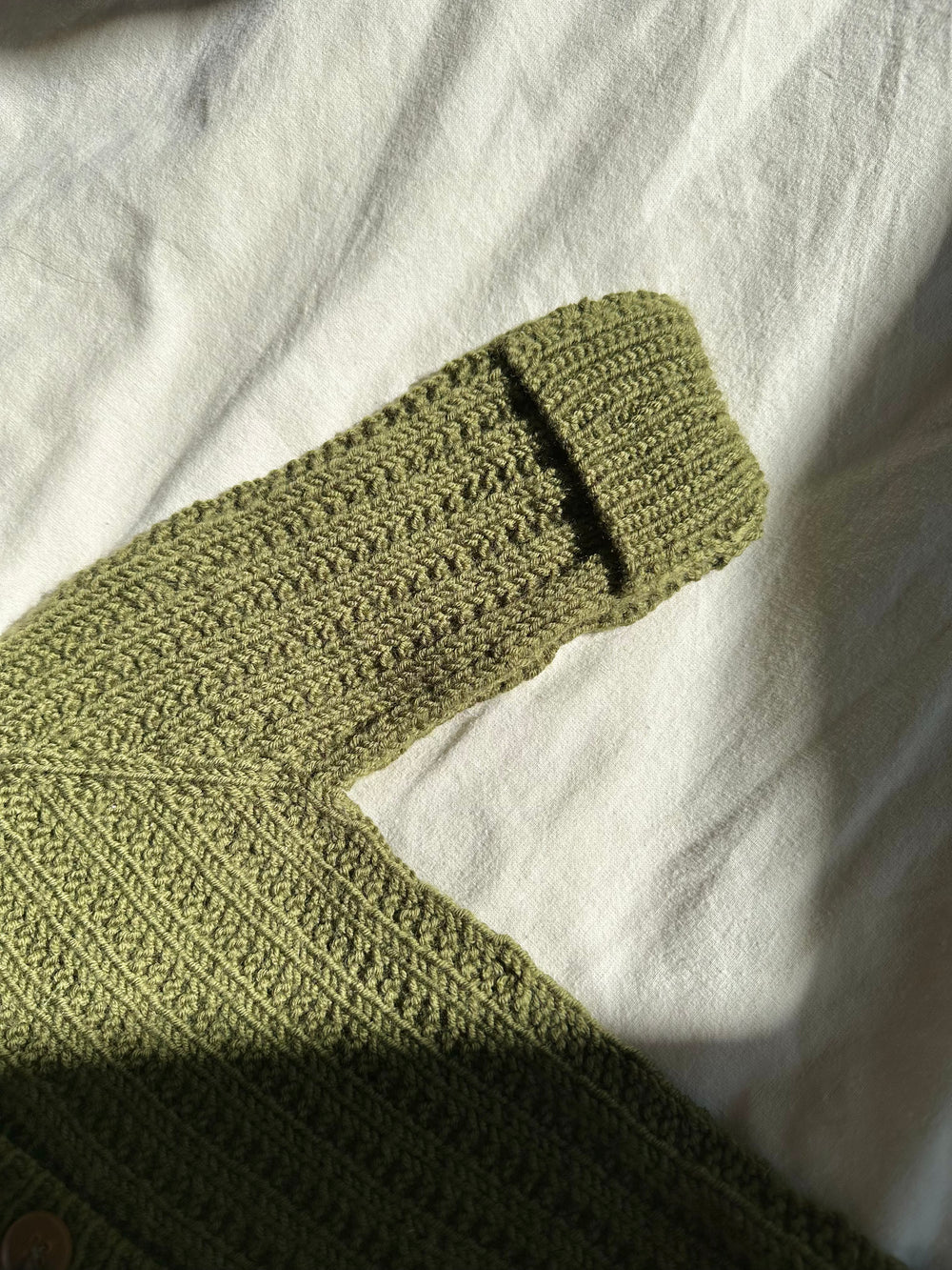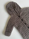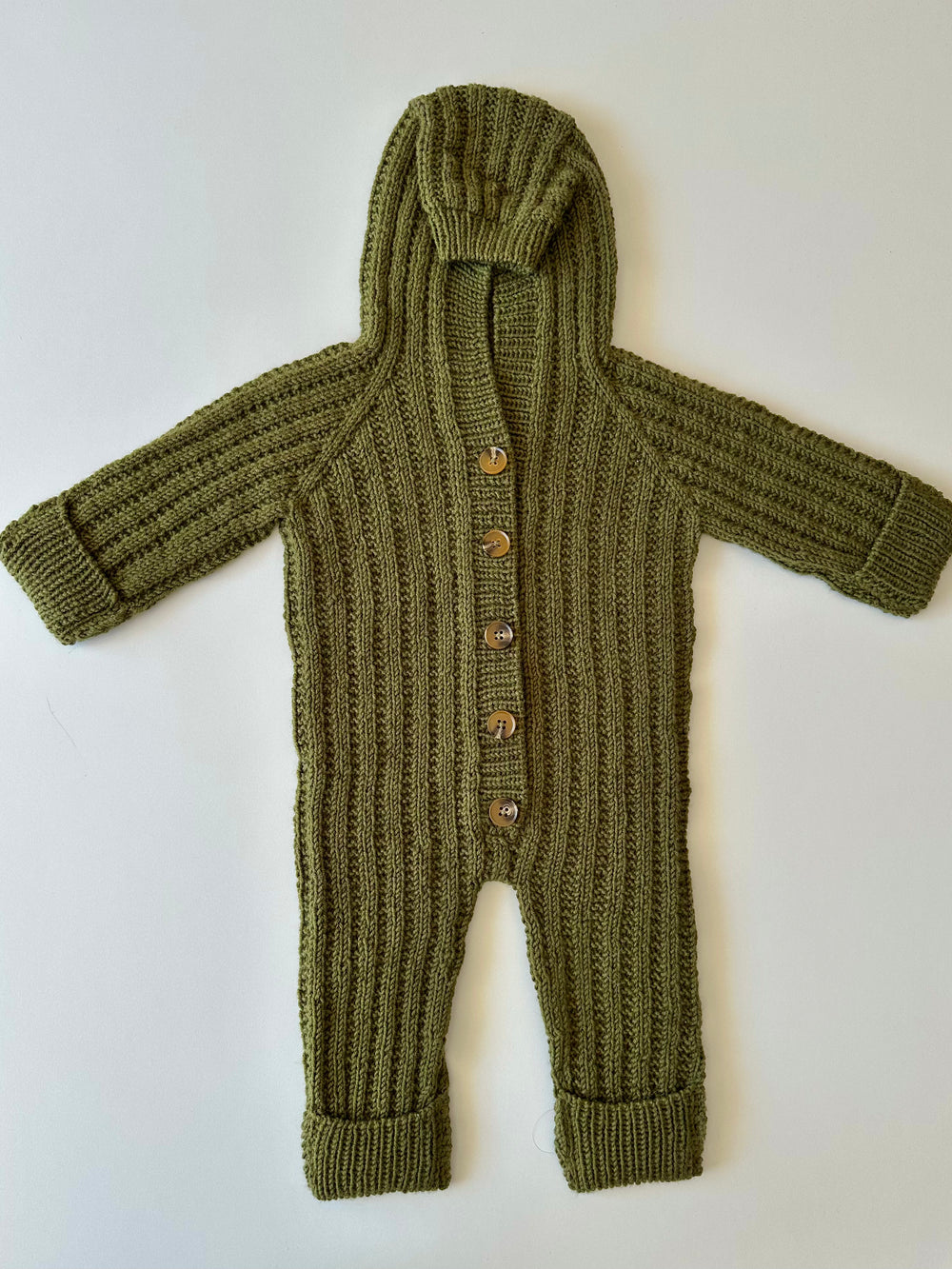 The suit is knit top-down with a hood, raglan sleeves, and legs and sleeves worked in the round with shaping. The edges at the bottom of the legs and sleeves are finished with small sewn-on patches for an optimal fit. The finishing touch is a button band with buttonholes and buttons.