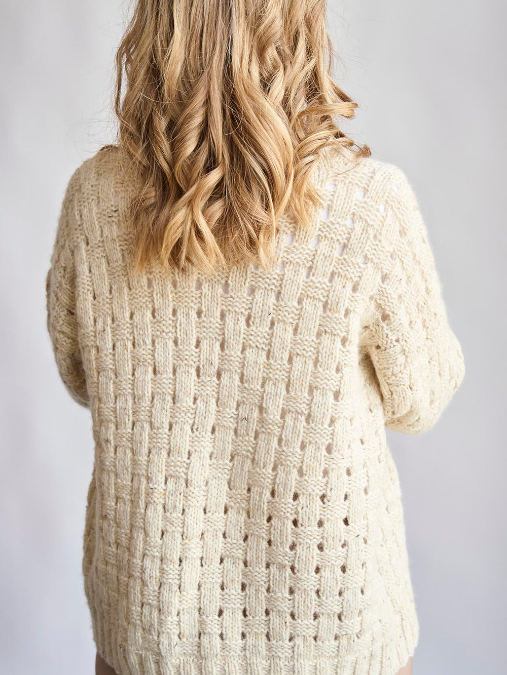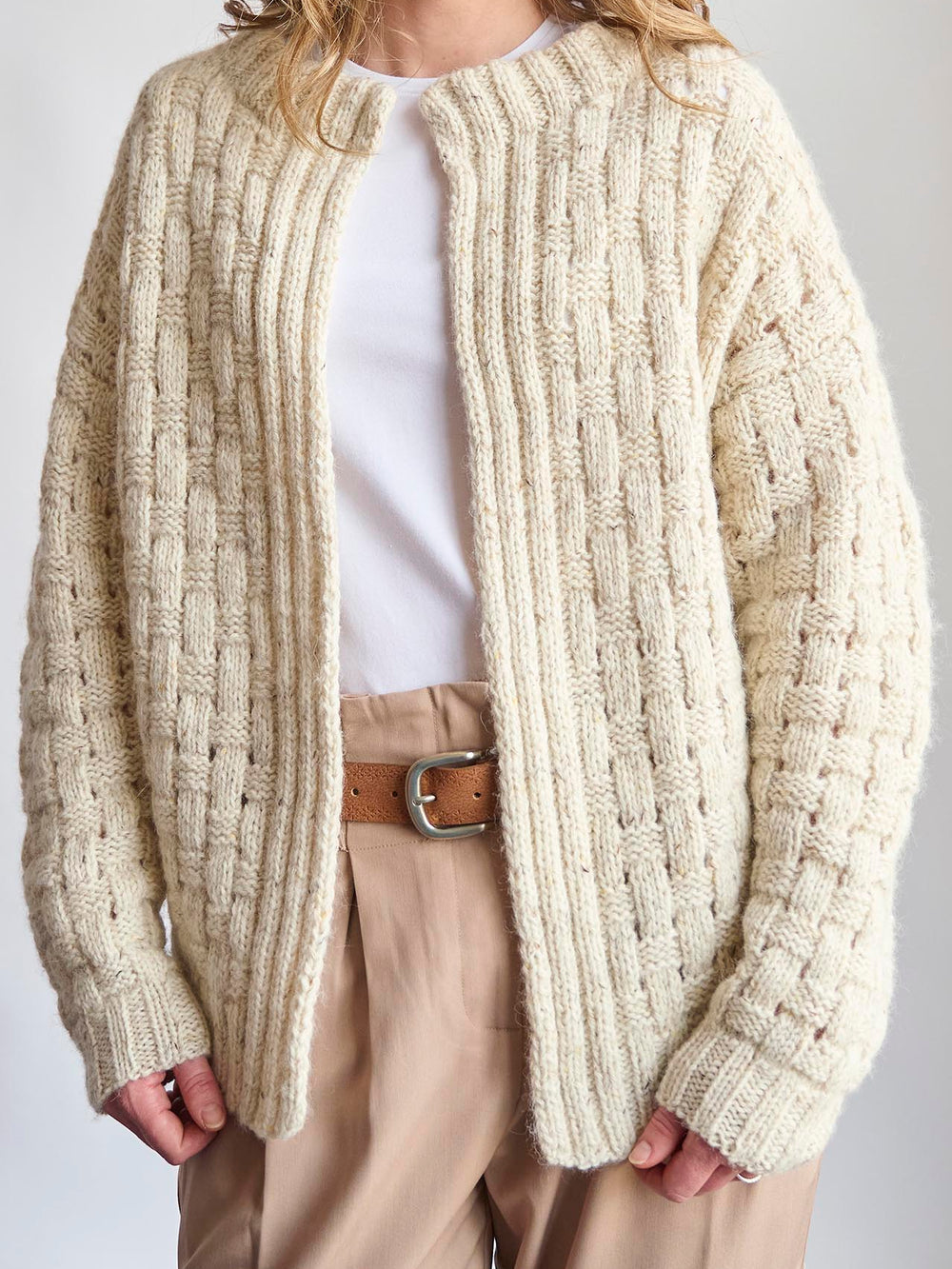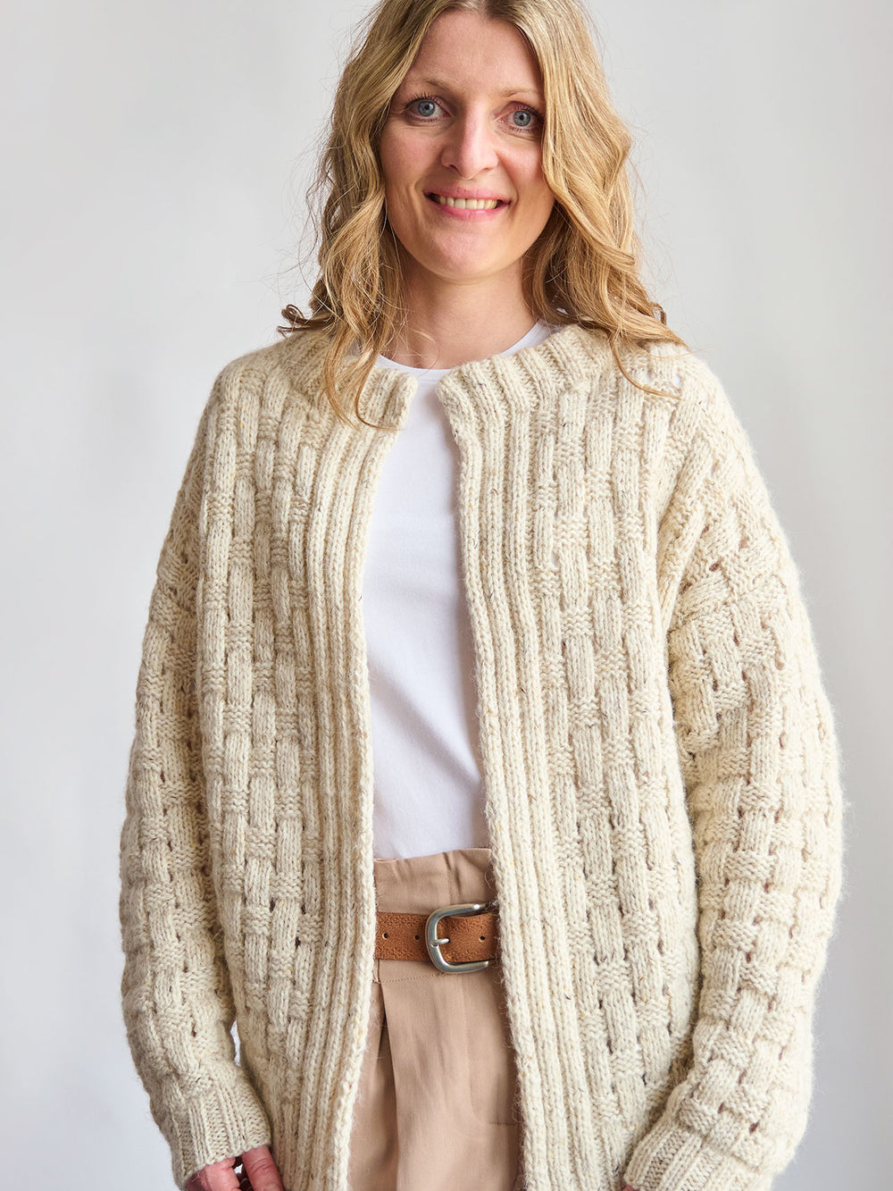 Birmingham is a woolly and soft tweed yarn with the most beautiful color play, York is an extremely soft wool yarn, while Premium Cassandra is spun from, among others, alpaca and silk. The combination of these 3 lovely yarns therefore results in a wonderfully soft and fuzzy cardigan.