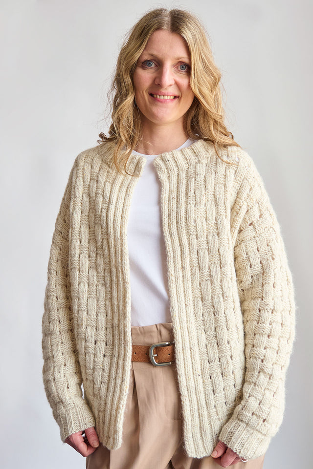 Cozy and soft cardigan, knitted from the bottom up in a beautiful cable pattern.