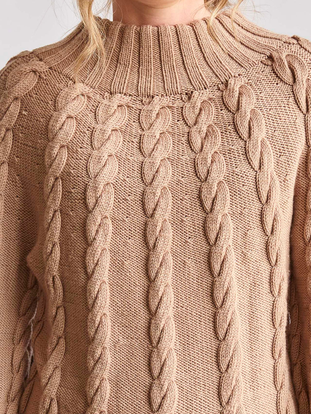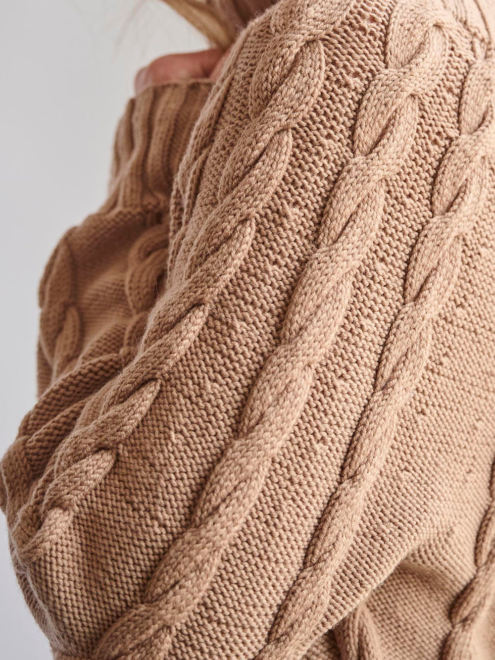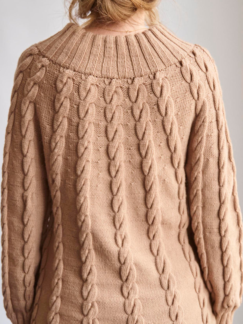 The model is knitted top-down with minimal assembly. Between the twists, purl stitches are knitted, and the neckline and sleeve edges are knitted in rib.