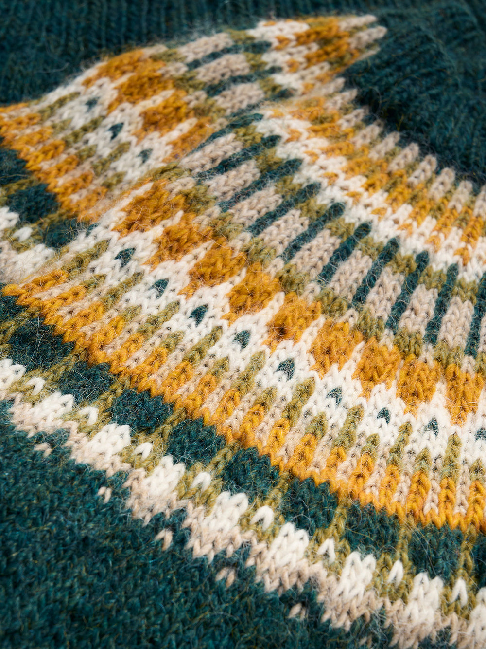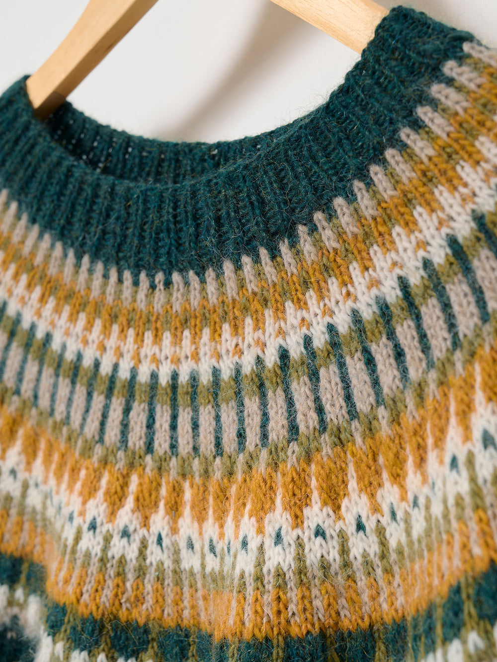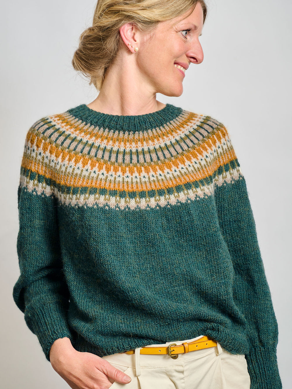 It is made using Mayflower Taormina Shade – a wonderfully soft and warm alpaca blend with a light texture. This keeps the sweater from being too bulky, while still making it cozy and comfortable to wear all year round.