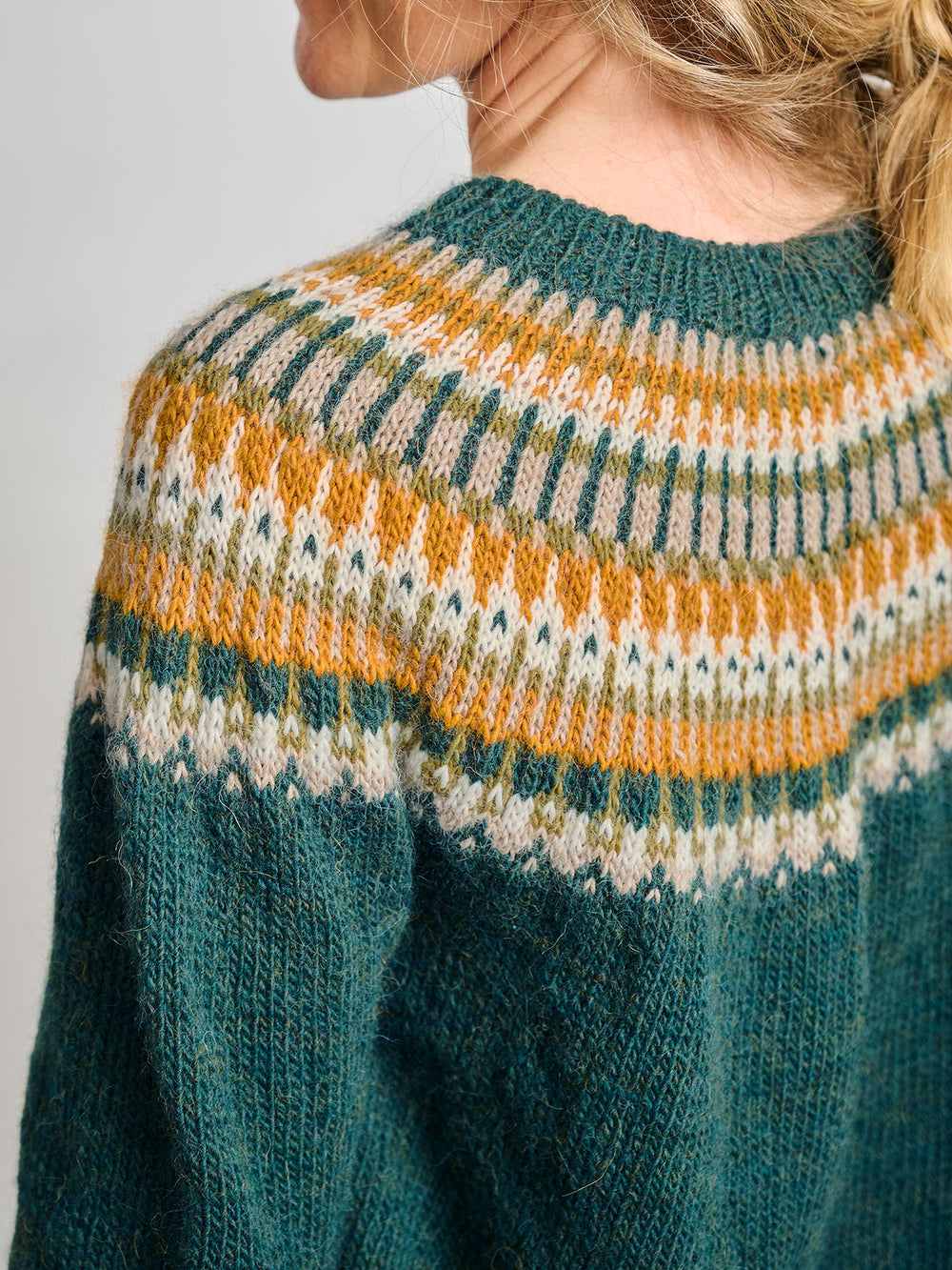 The Celeste Sweater by PetiteKnit is worked from the top down with a classic round yoke featuring beautiful colorwork. The sweater is knitted in stockinette stitch with ribbed edges.