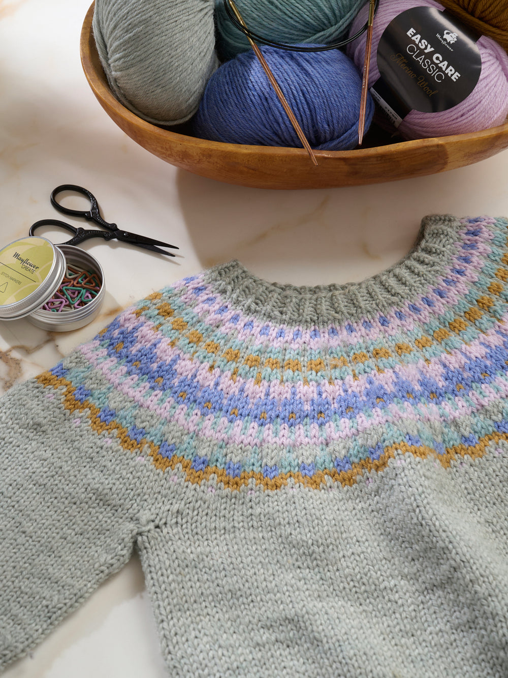The Celeste Sweater is knitted in Mayflower Taormina Shade – a lovely, soft alpaca blend with a light texture. This makes the sweater warm and cozy without being too thick – perfect to wear all year round.