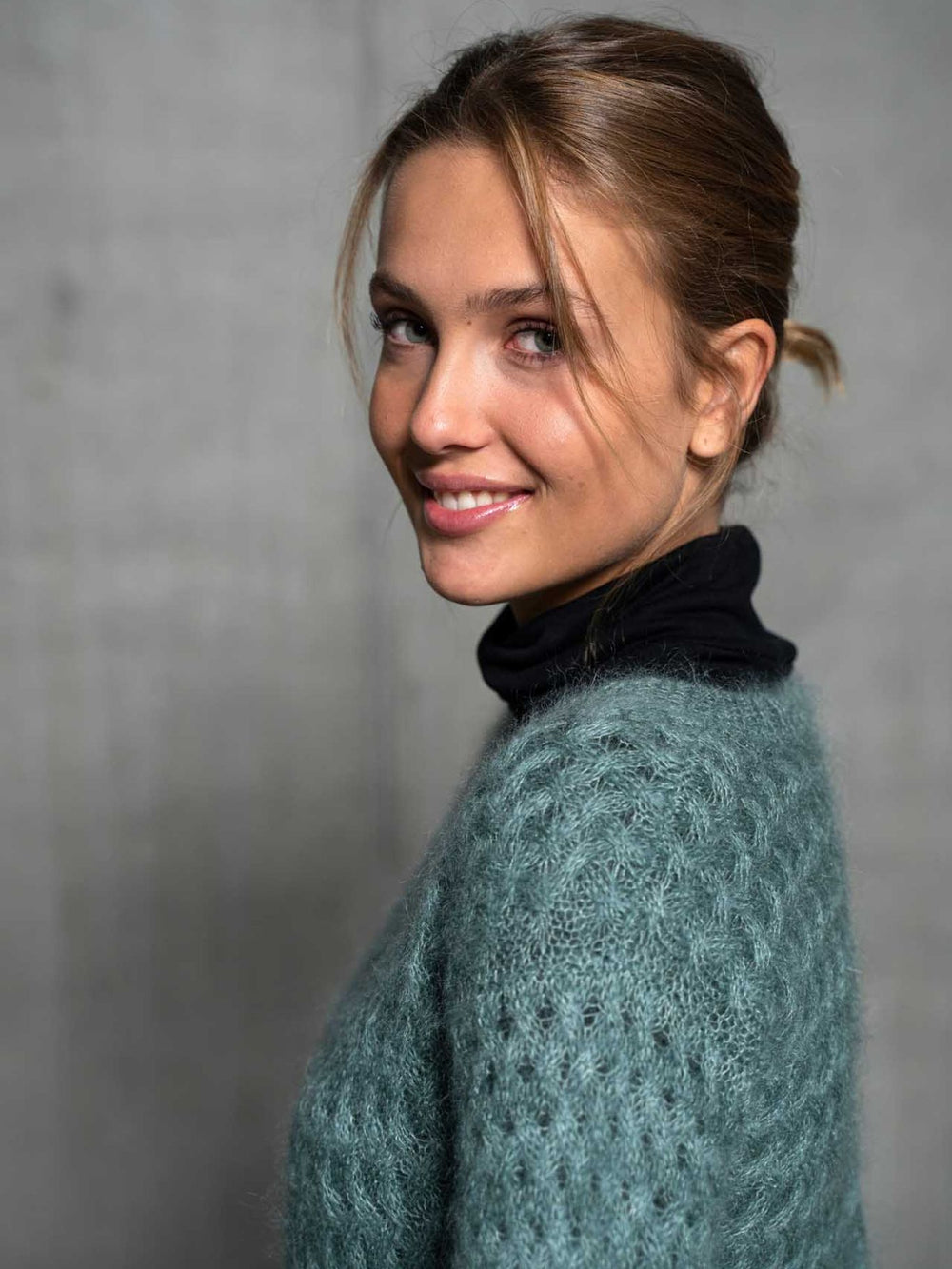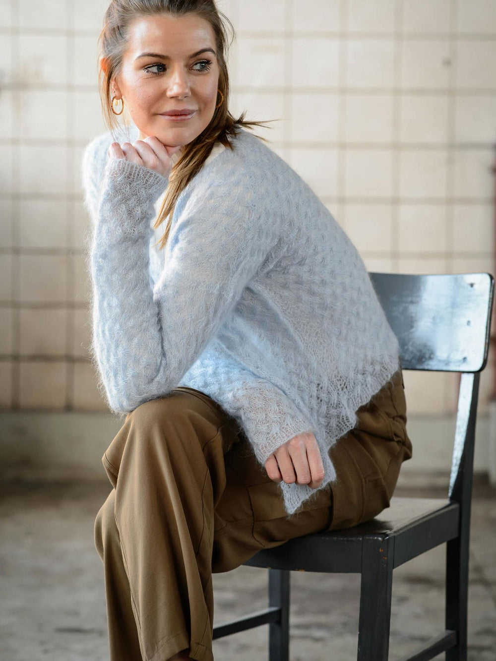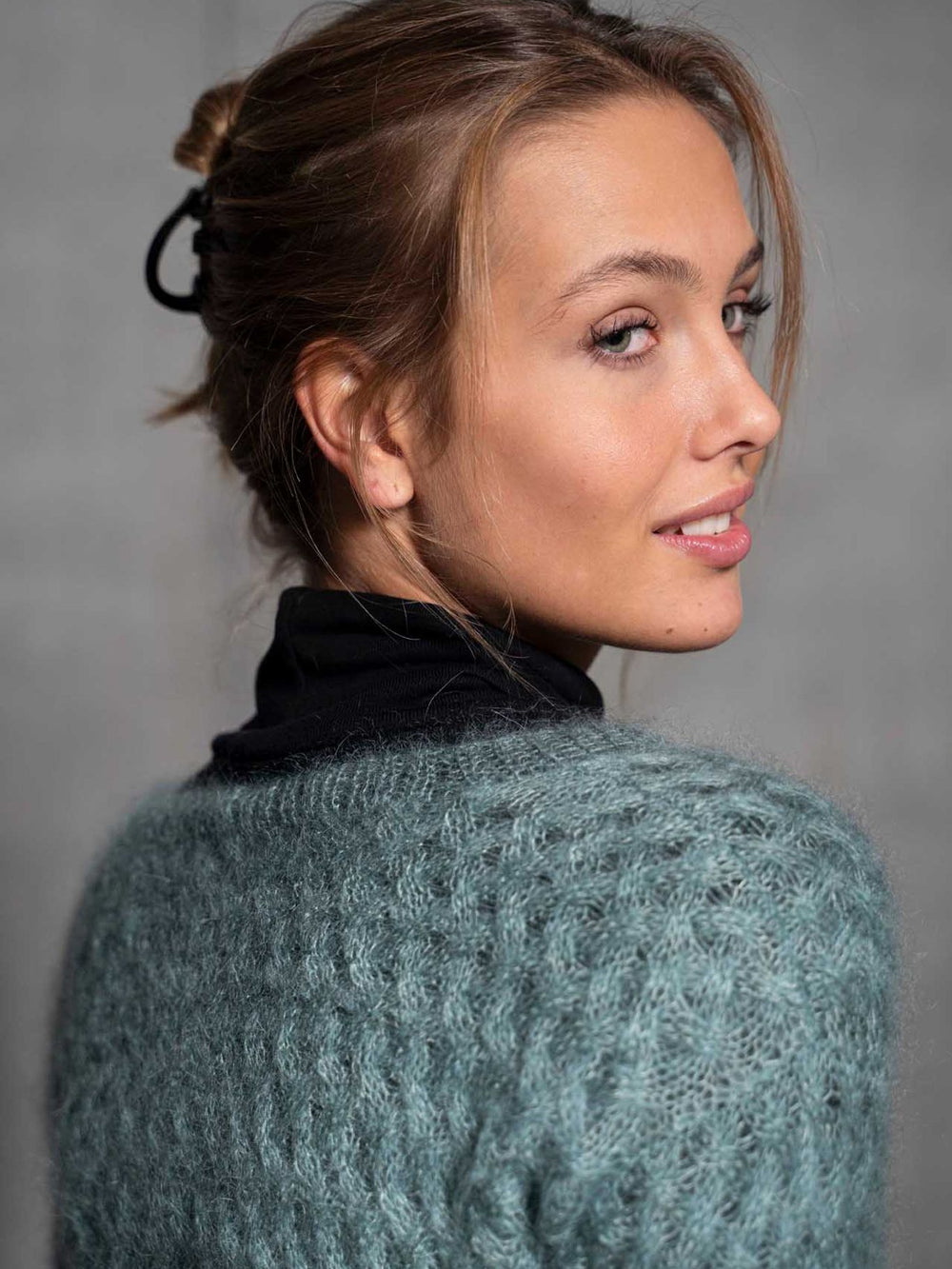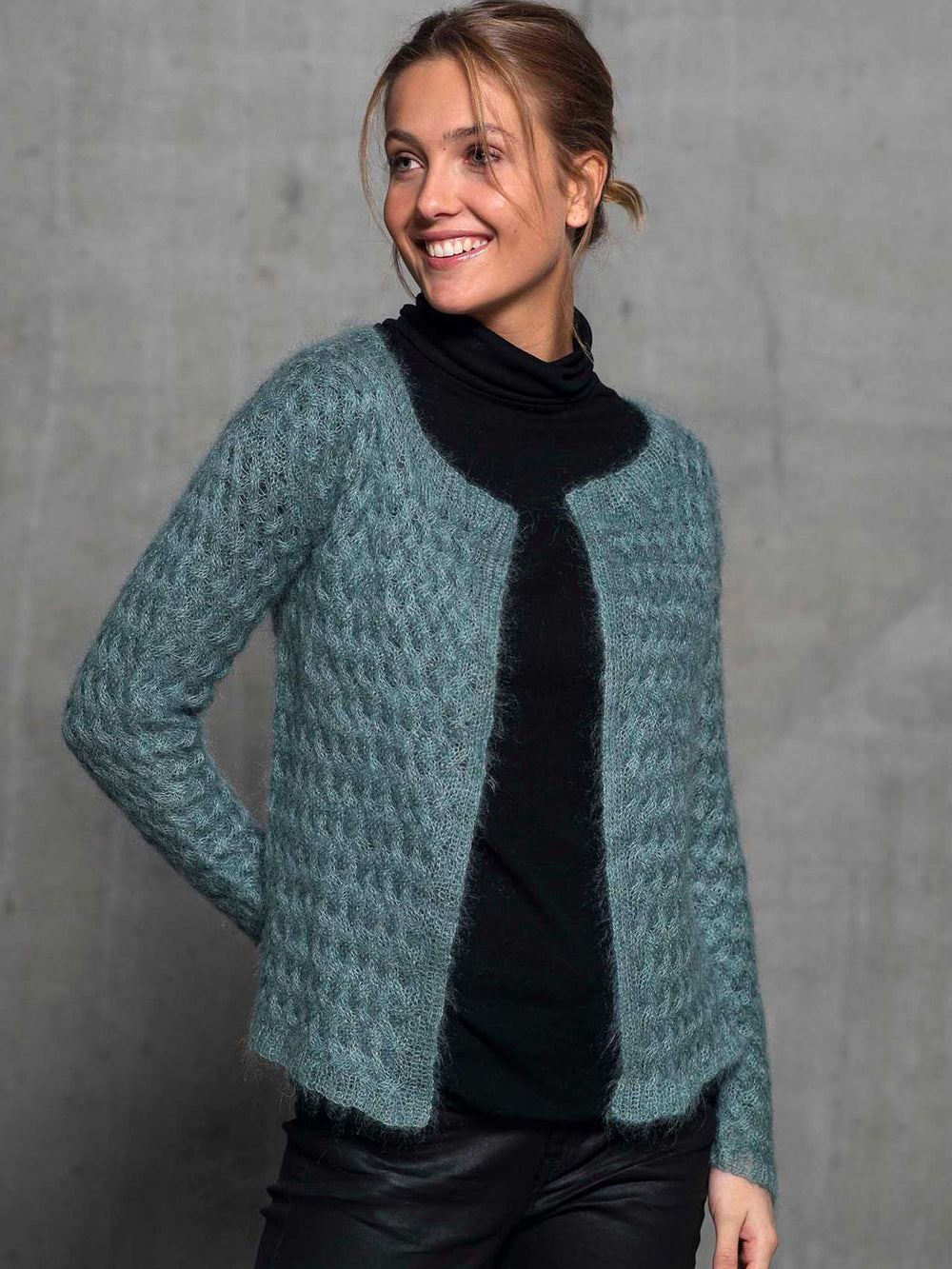 This beautiful cardigan is knitted in the lovely Mayflower Super Kid Silk, which is an exclusive yarn quality made of 76% mohair and 24% silk. A delightful combination that gives this cardigan a light and airy appearance.