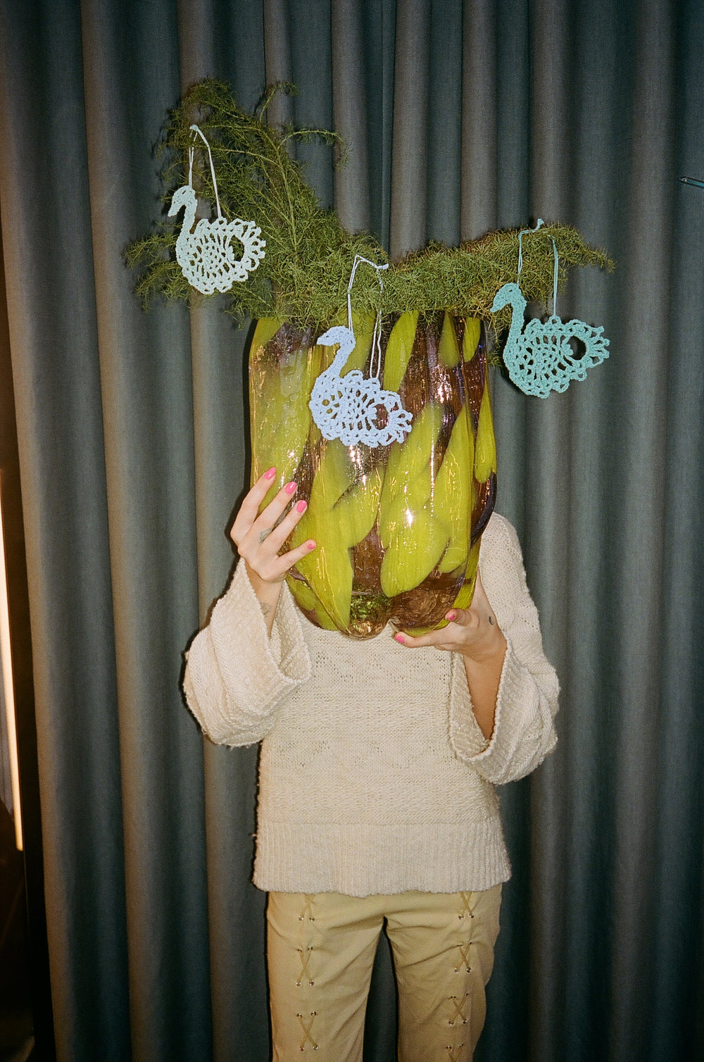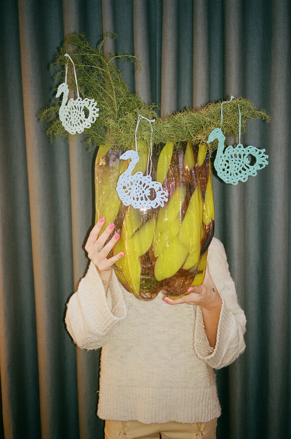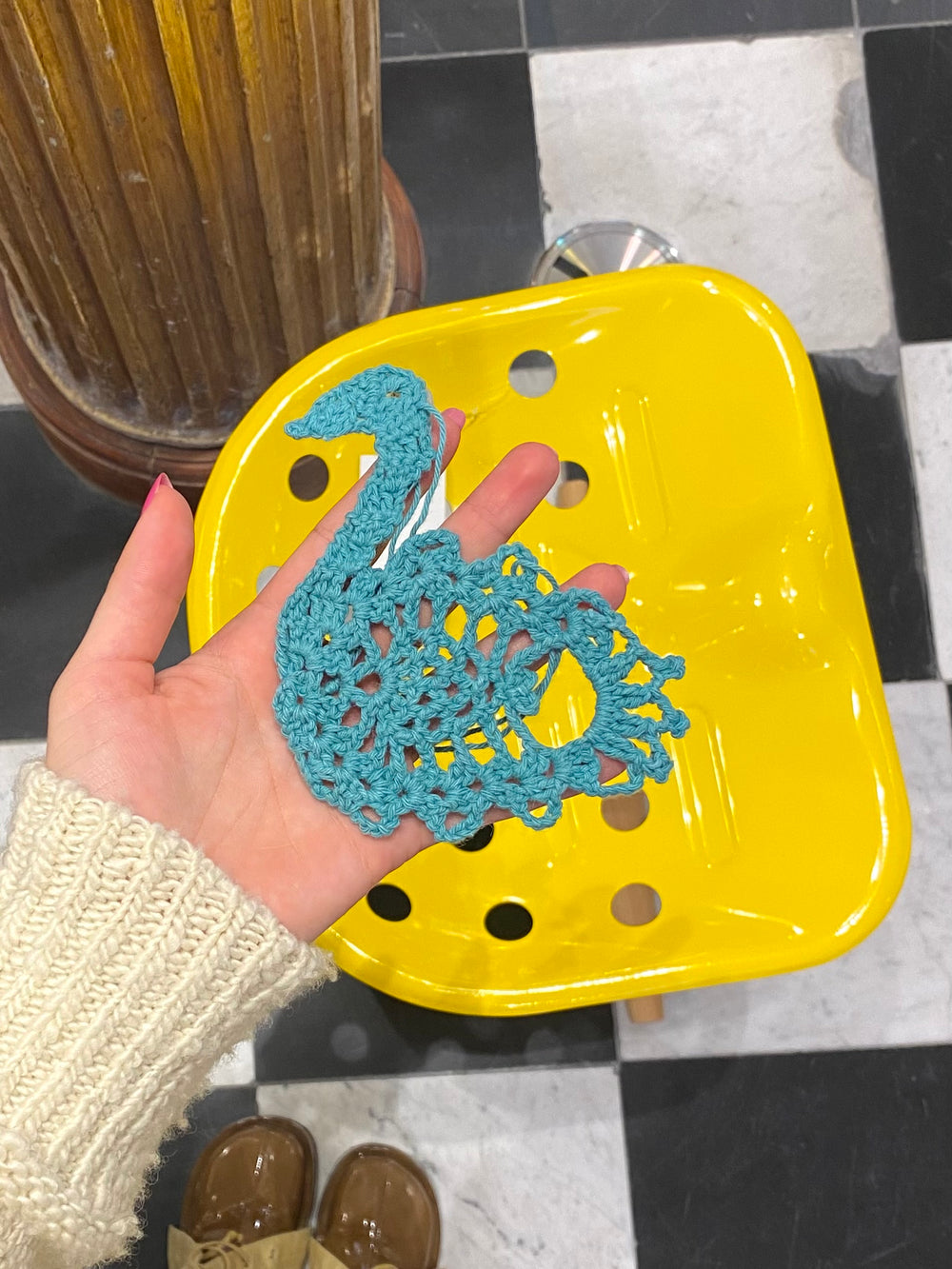 The swan is crocheted in rows back and forth following a diagram. First, the body of the swan is crocheted, and then the neck is crocheted directly onto the body. Finally, the swan is stiffened using sugar water.