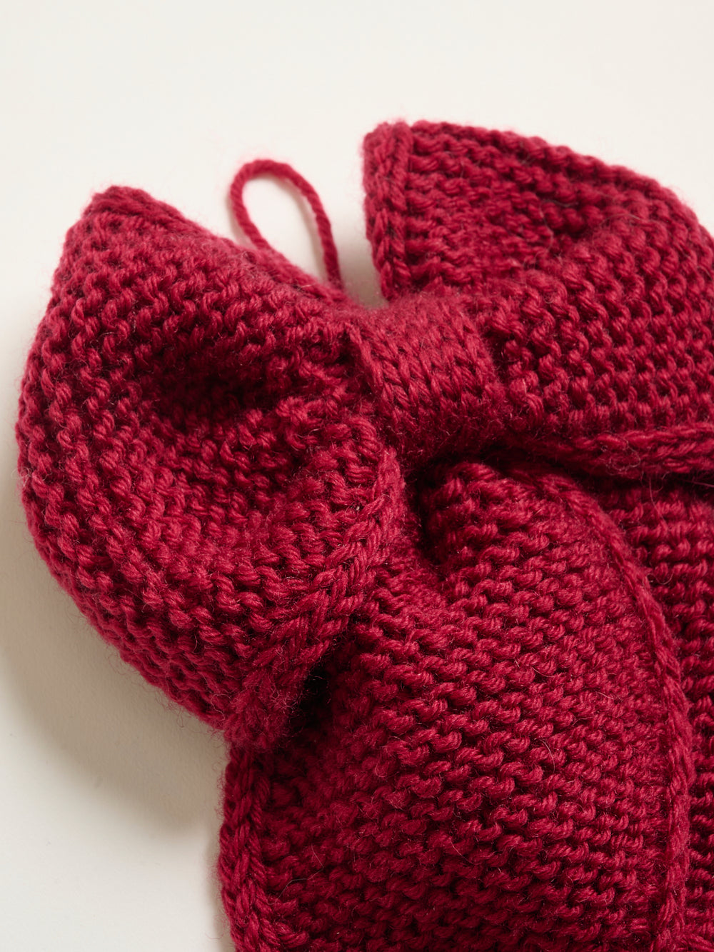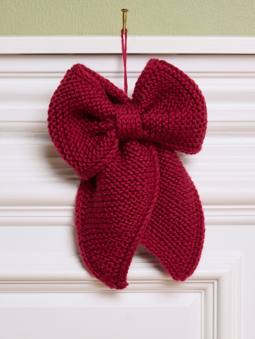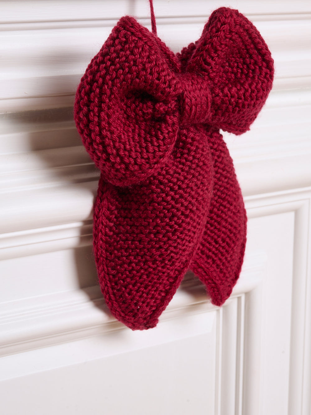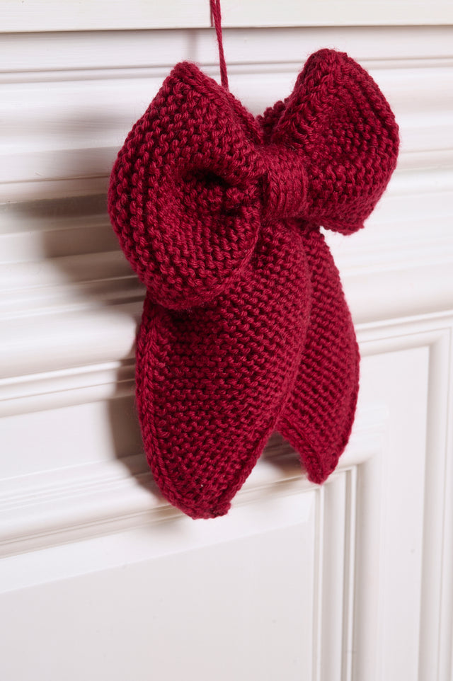 The Christmas bow is worked back and forth in garter stitch from tip to tip, with i-cord edges along the sides. It is then folded into a bow and sewn together. Attach a string or similar to the back so the bow can be hung.