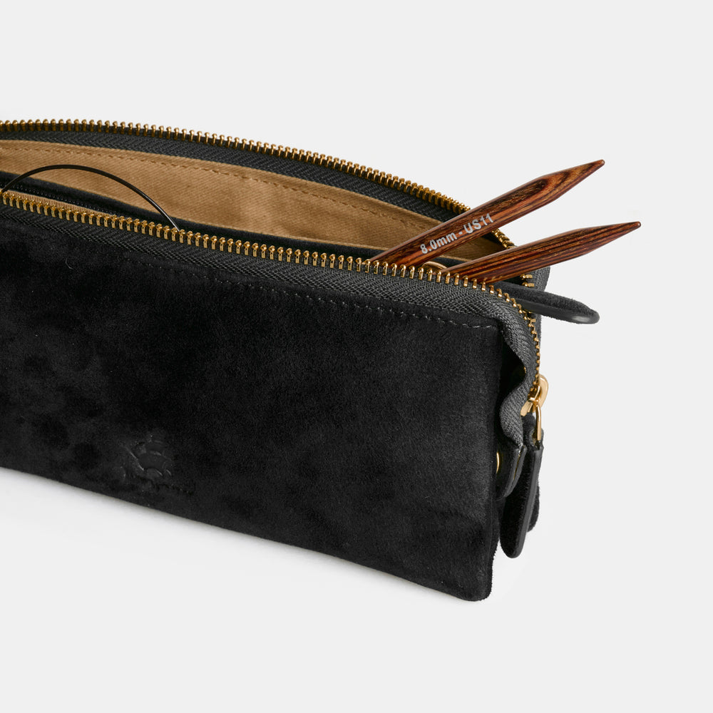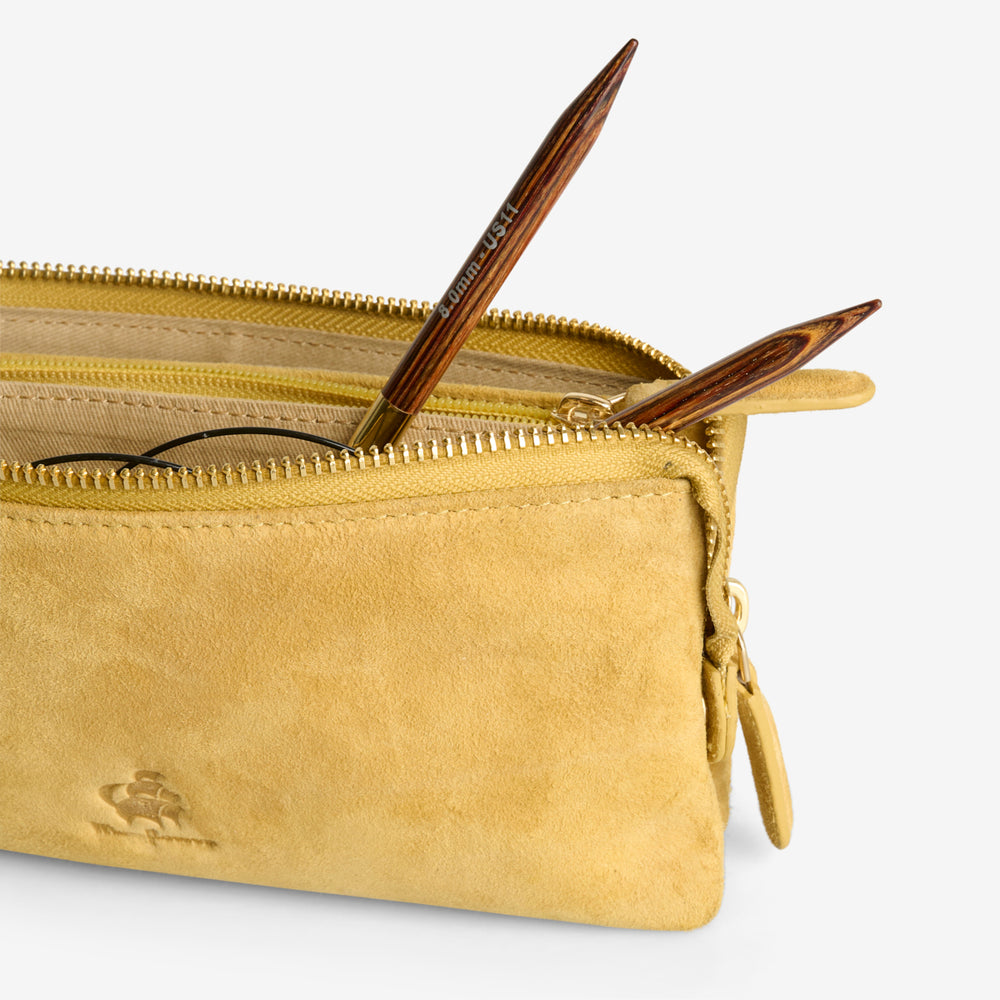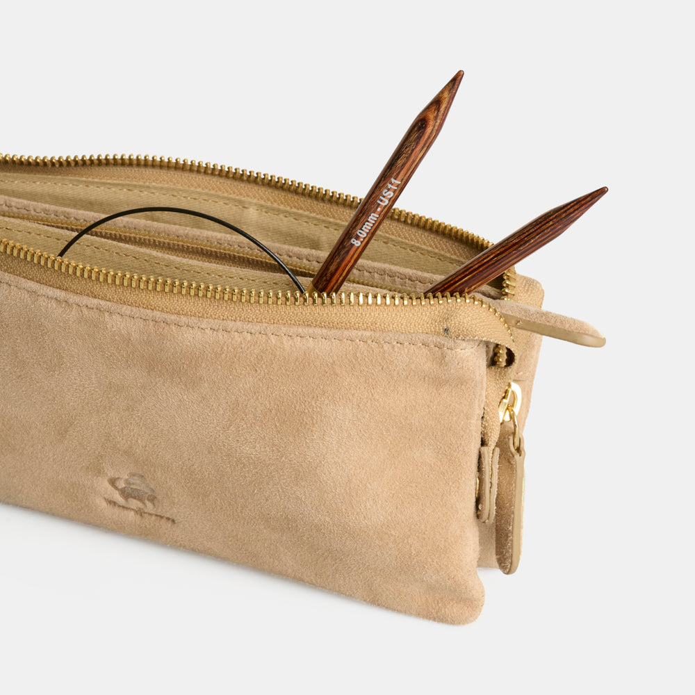 It opens with a golden zipper, and inside you'll find two larger compartments with a smaller zip pocket in the middle. It’s ideal for interchangeable circular needles, scissors, measuring tape, etc., while smaller items like stitch markers, wool needles, and cables can be stored in the smaller compartment.