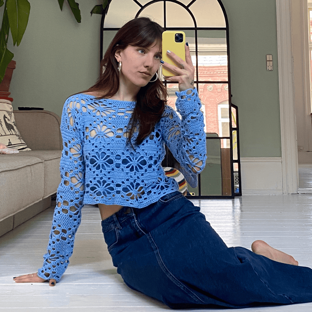 Flora Shirt is one of Rose's most popular designs. She originally released the lace pattern as a skirt in her first crochet book, but quickly felt that the skirt needed a matching sweater. That's how Flora Shirt came to be.