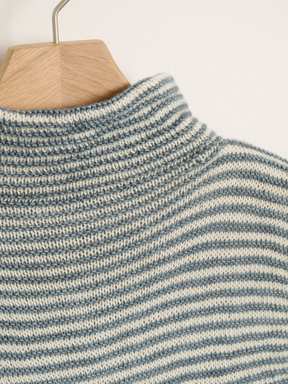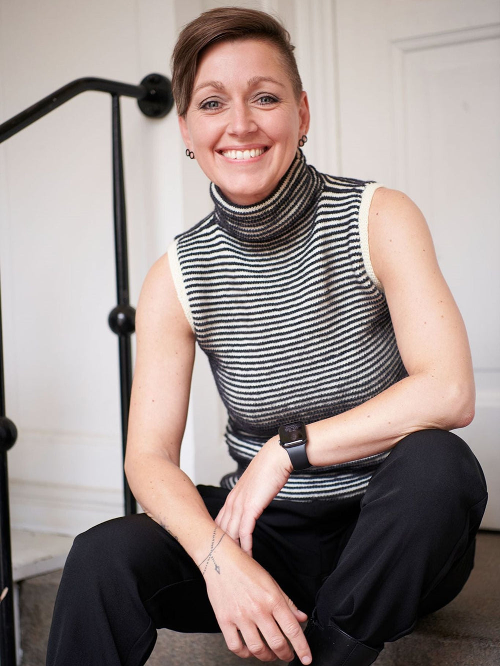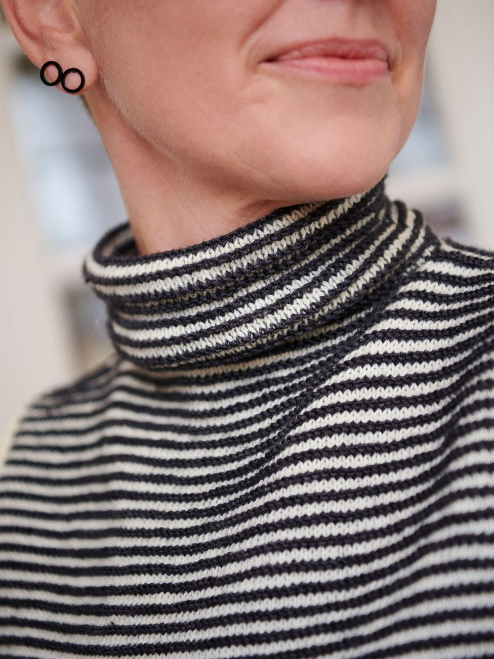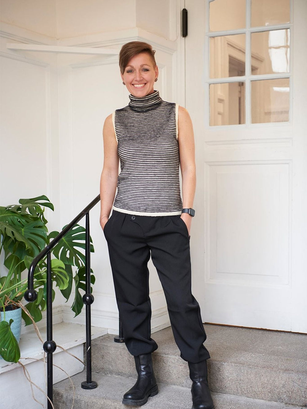 The vest is knitted in the fine, hand-dyed yarn Mayflower Amadora, which is spun on extra fine merino wool. Amadora therefore has a wonderfully soft texture, making the vest really lovely to wear, just as the turtleneck feels nice around the neck. The vest can therefore be worn on its own, as well as over a thinner blouse.