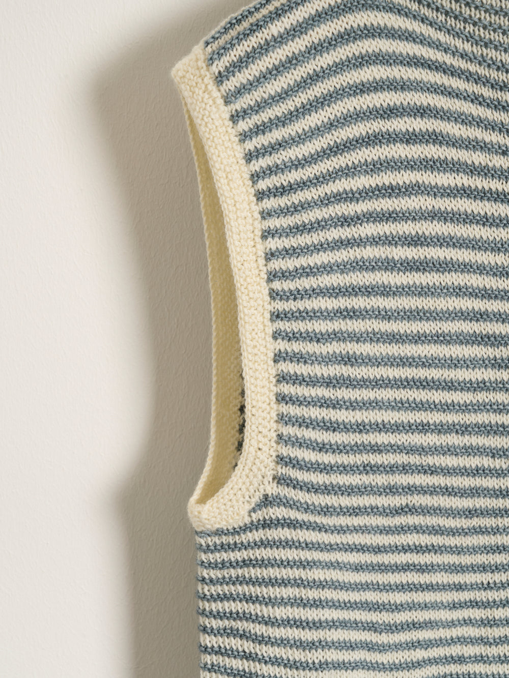 The vest is knitted from the bottom up in a striped pattern, which gives a bit of a 3D effect. The vest is knitted in a stockinette stitch pattern, interrupted by a purl row, which gives the beautiful effect. The striped effect becomes most evident when the vest is knitted in colors with high contrast.