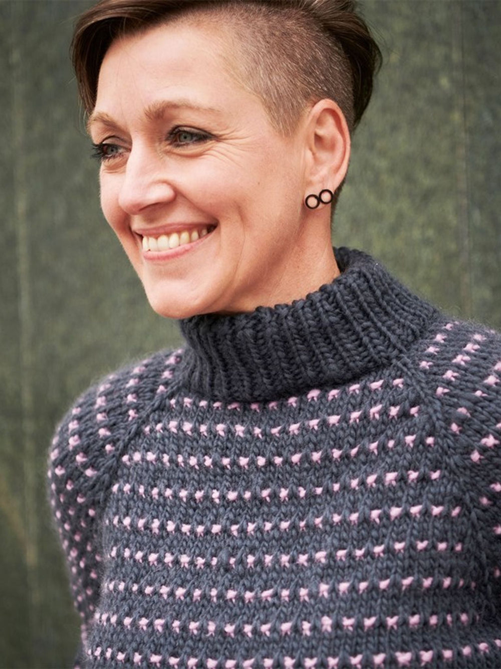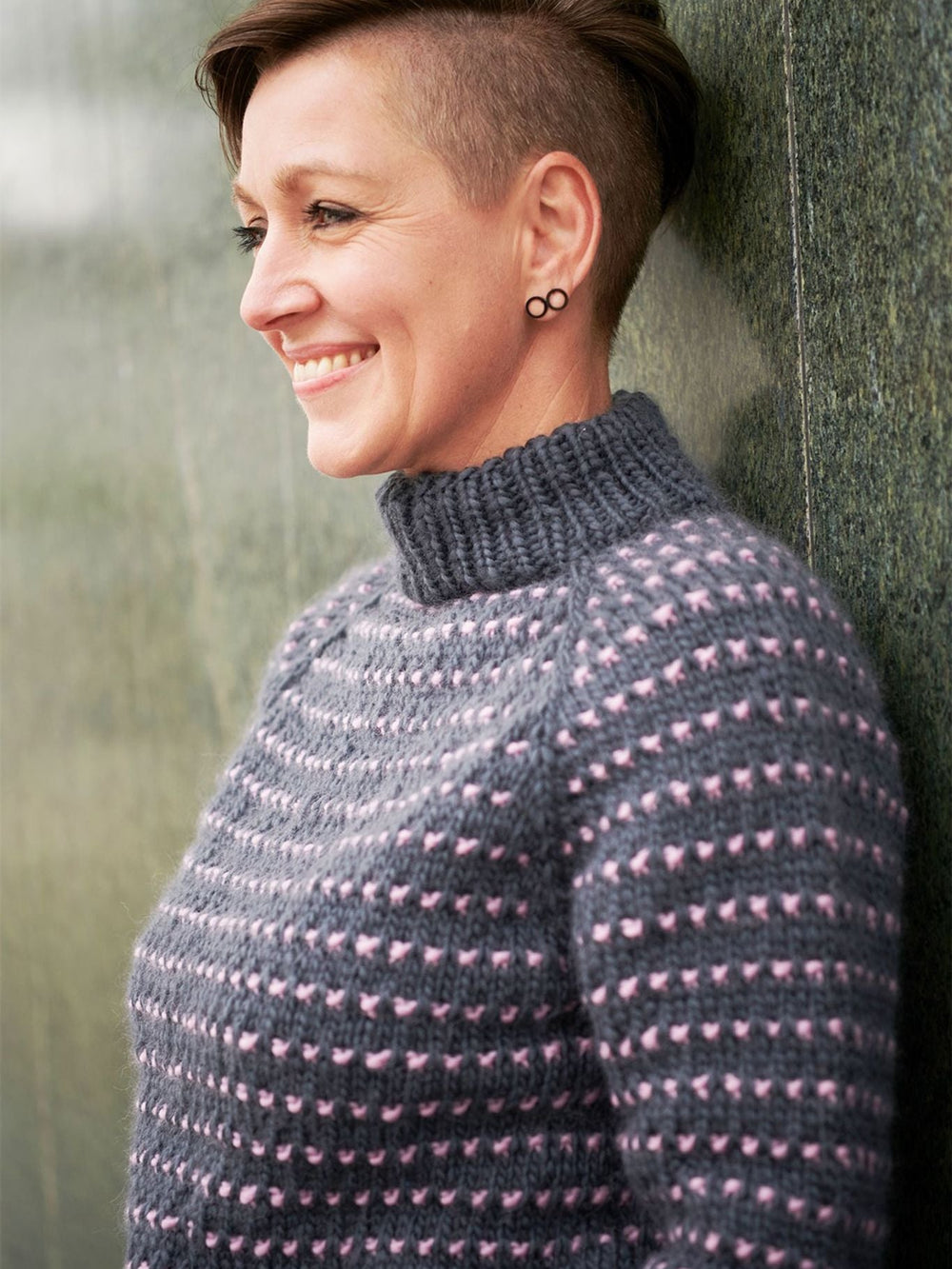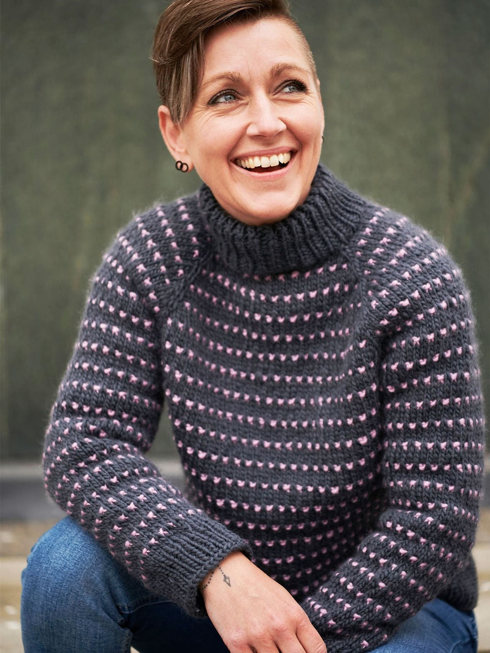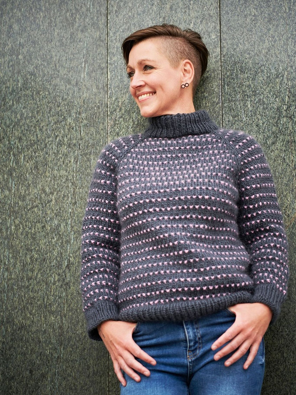 The construction with woven knitting in a contrasting color gives the sweater a really beautiful color effect, where you have the opportunity to play with the colors and create your own exciting expression. The construction is also beginner-friendly and easy to approach.
