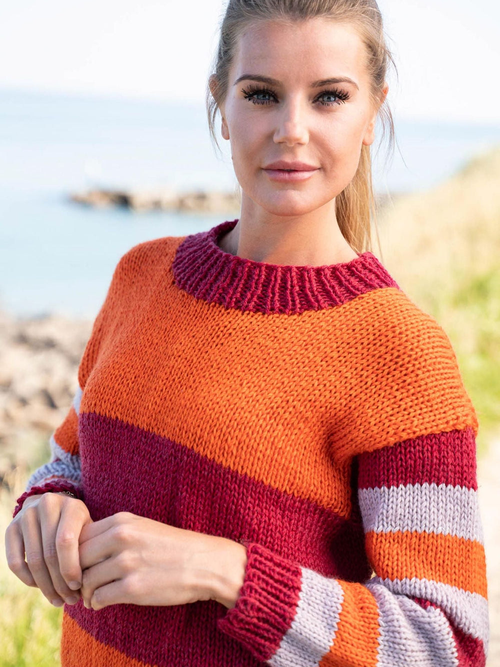 The sweater in the picture is knitted in cerise, orange, and light purple, but you can also put your own touch on the sweater by choosing other colors. It is also an option to knit with two threads in different colors to create a beautiful mottled color effect.
