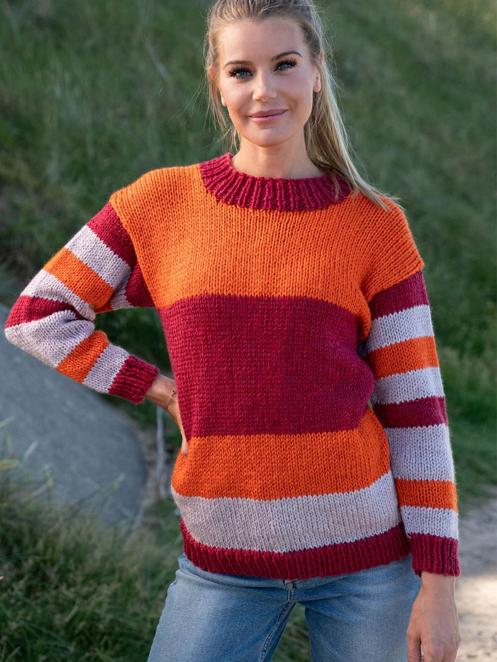 Knitted stripes are a wonderful and simple way to give a sweater lots of personality. We have utilized this in this lovely sweater, which is knitted with beautiful block stripes in two threads Mayflower Easy Care Classic.