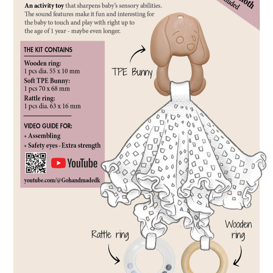 With the sensory kit from Go handmade, you get various accessories that you need to crochet a lovely and soft cuddle cloth. The crocheted cloth is mounted on a soft TPE rabbit figure, and at the bottom, there is also a wooden ring and a rattle ring. Both the figure and the rings are fun to play with, as there is both something soft and something hard to touch, just as one of the rings can rattle (NOTE: Remember that the yarn for the project must be purchased separately).