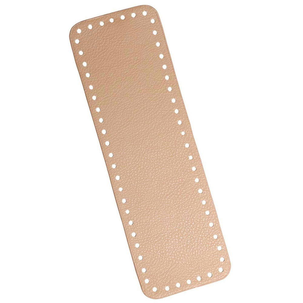 The bag bottom or basket bottom is made of 100% PU leather with a thickness of 3.5-4 mm and a hole size of 5 mm. The bottom has slightly rounded corners and is hand washable. The leather bottom is in the color apricot and measures 31 x 10 cm.