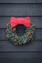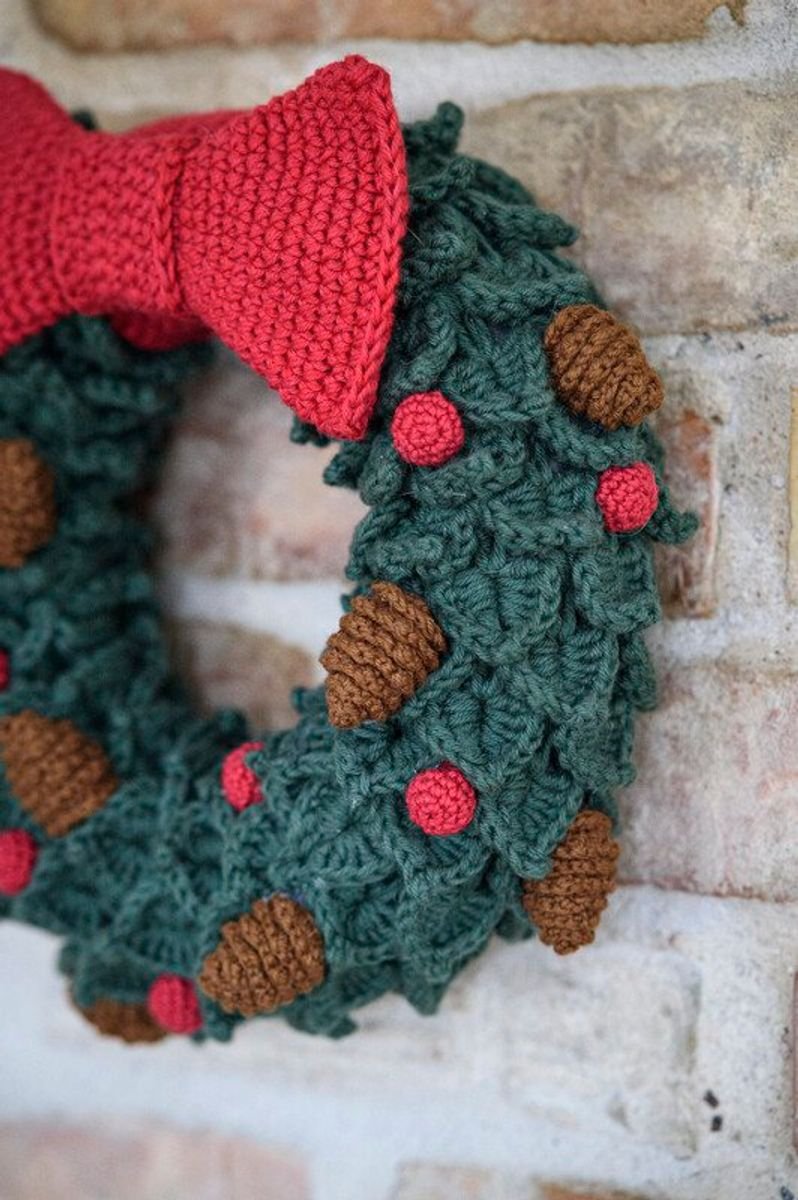The Christmas wreath's leaves are crocheted with the technique called crocodile scales. Then, the rectangular piece with crocodile scales is sewn onto a polystyrene wreath to give the wreath its shape.