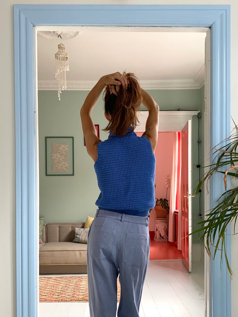 The Heart Vest is a unique vest, crocheted with single crochet stitches in two pieces from the bottom up. The most striking feature of the vest is the sweet heart-shaped hole on the front piece, which adds a charming and personal touch.