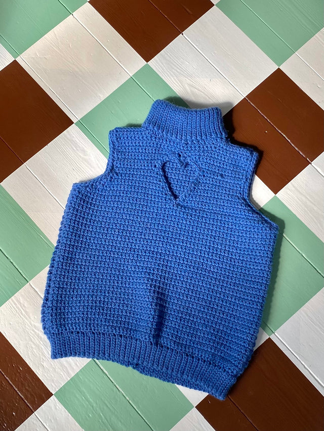 The Heart Vest is a unique vest crocheted with single crochet stitches in two pieces from the bottom up. The most striking feature of the vest is the cute heart-shaped hole on the front piece, which adds a charming and personal touch.
