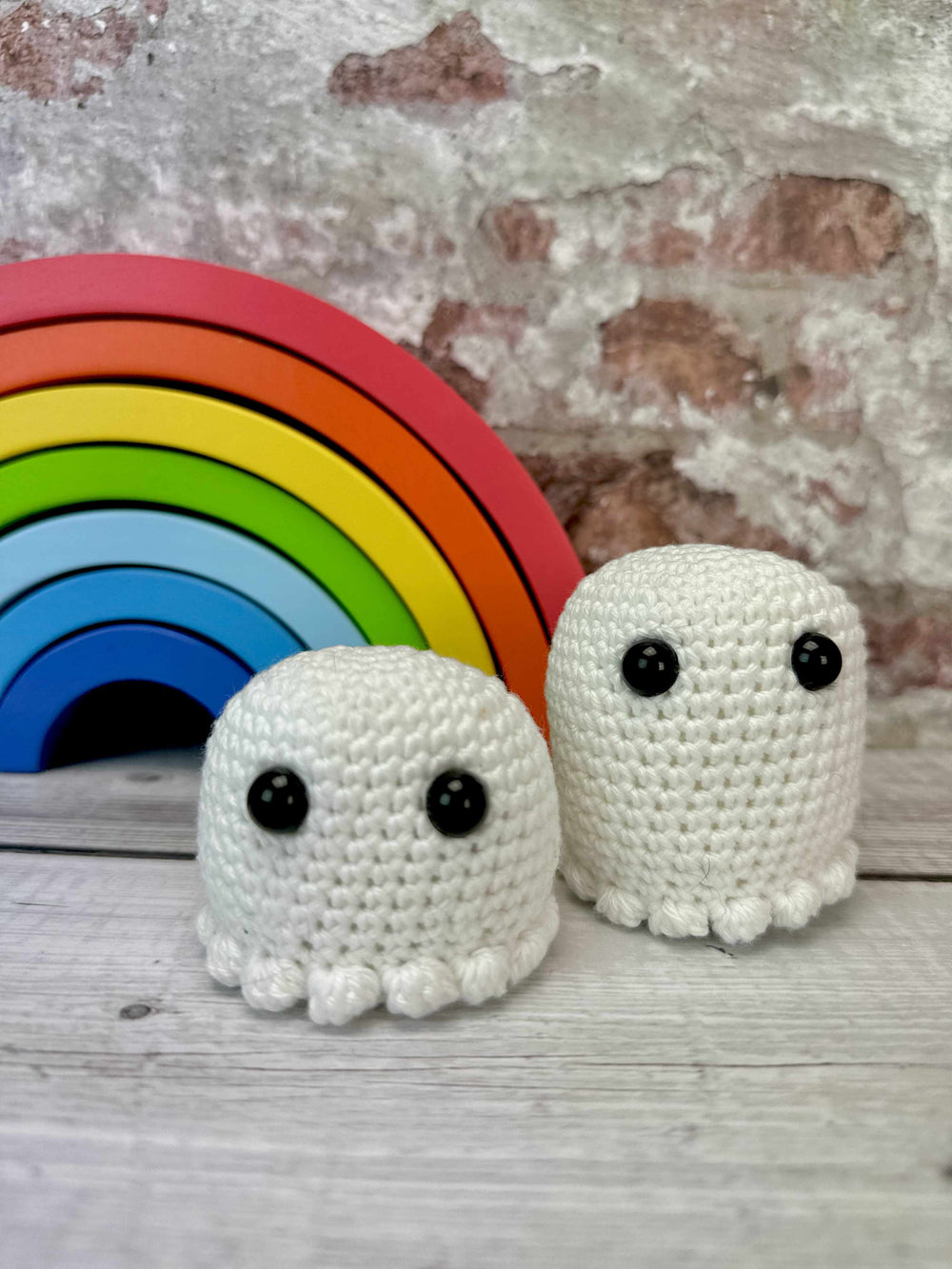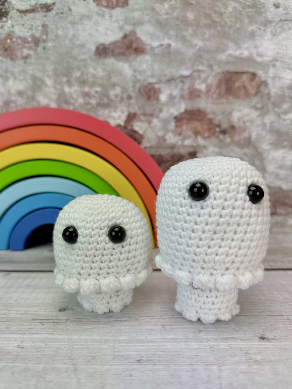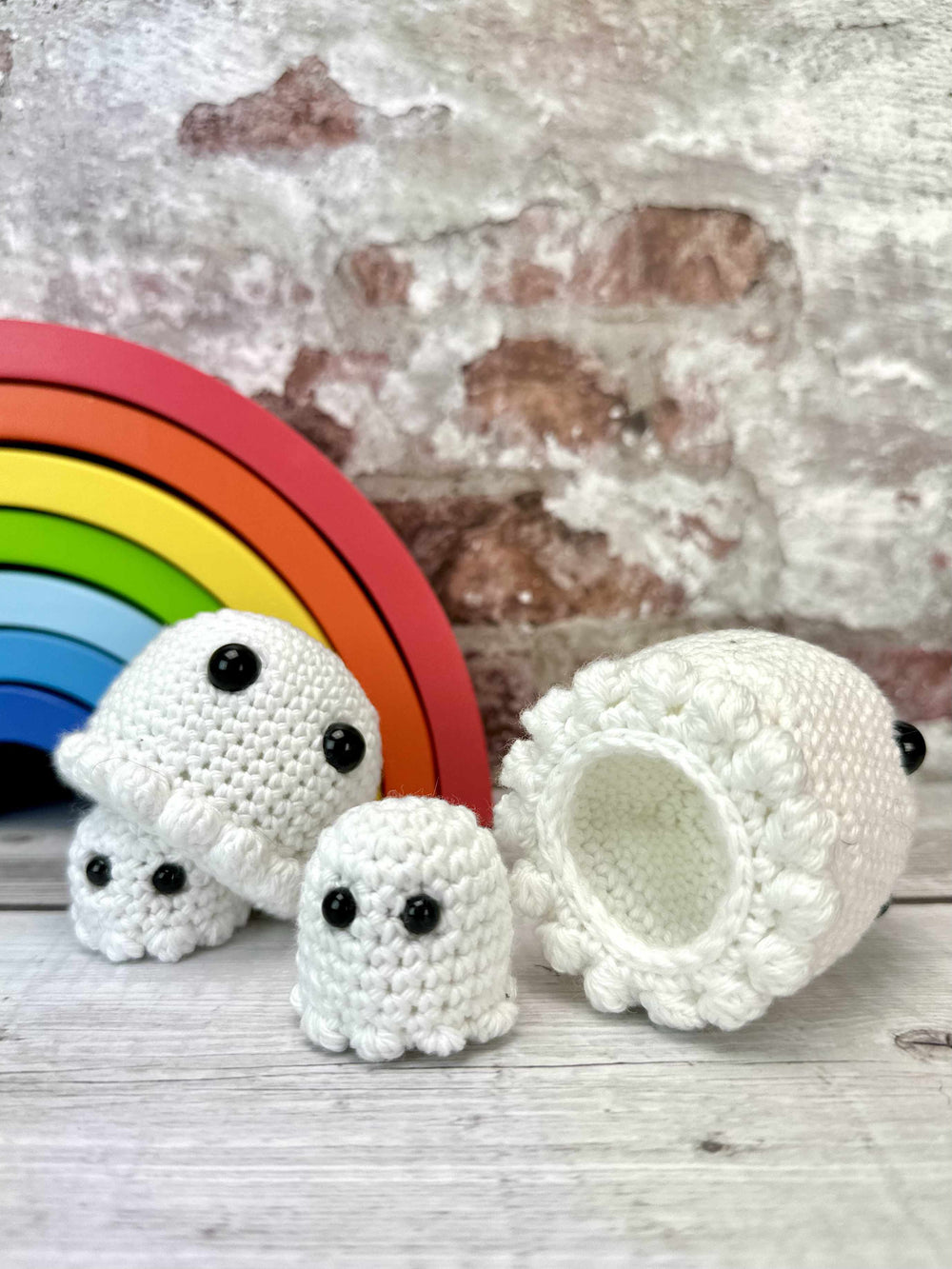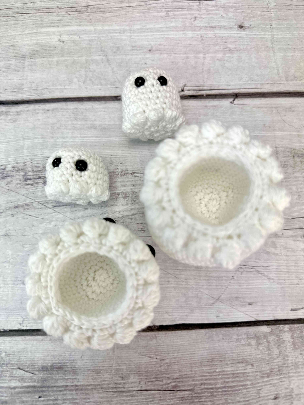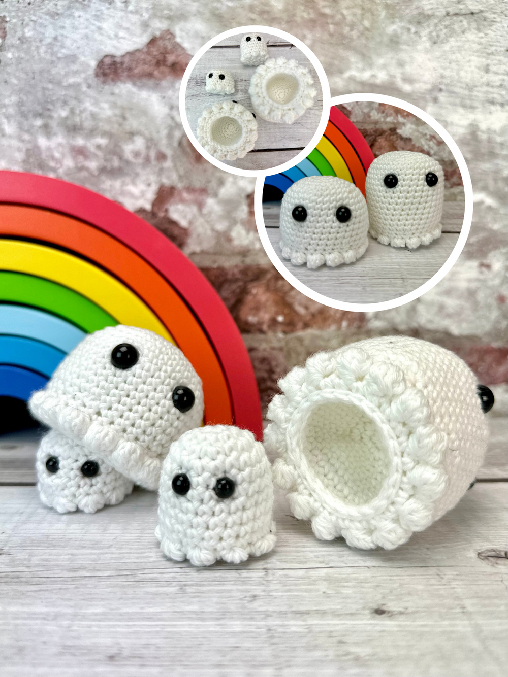 You get two large ghosts - one tall and one short, with a tall and a short mini ghost that fit inside. The pattern also includes the option to make the large ghosts without a hole for the small ones.