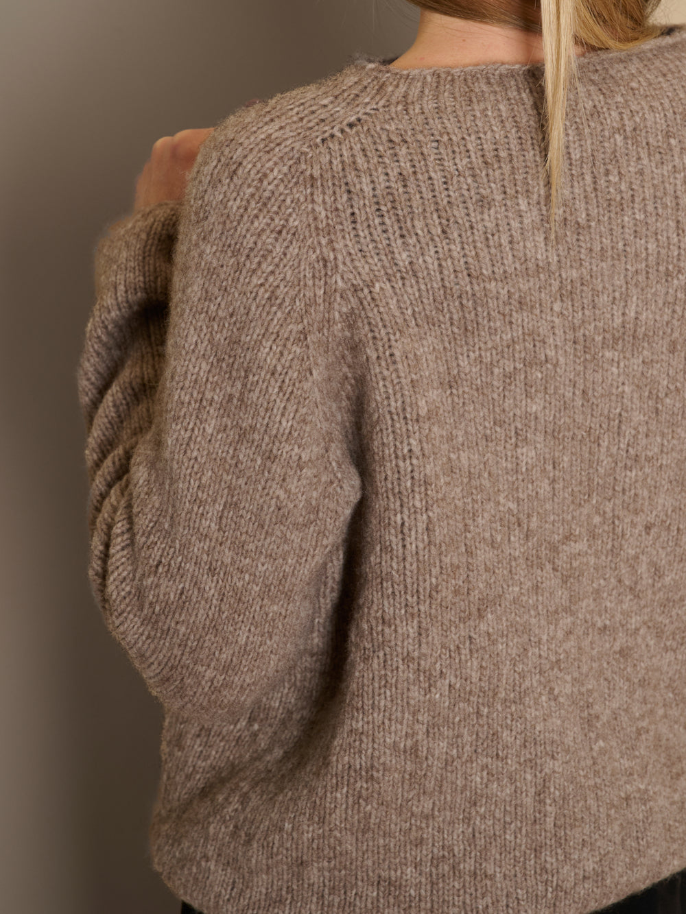 The Ivy Sweater is worked top-down with raglan increases in the yoke and short rows at the neckline. The sweater is knitted in stockinette stitch.