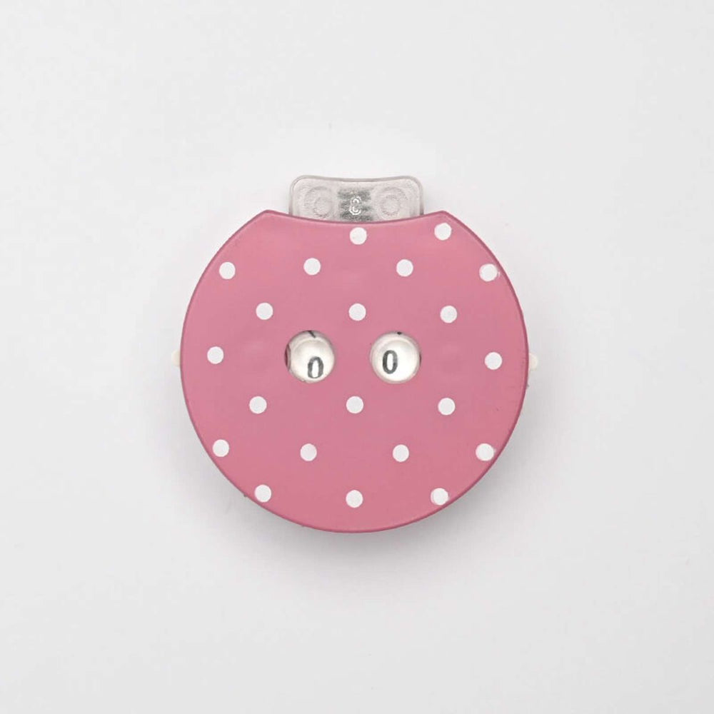 Row counter from KnitPro, which helps you keep track of how far you have come with your knitting or crocheting work. The rows, needles, or stitches change by pressing at the top. The row counter comes in a nice pink color with white dots.
