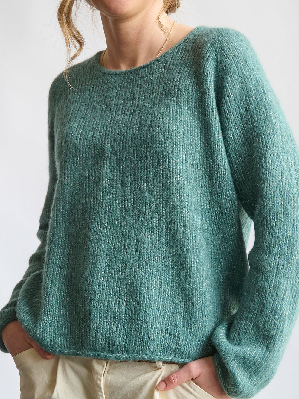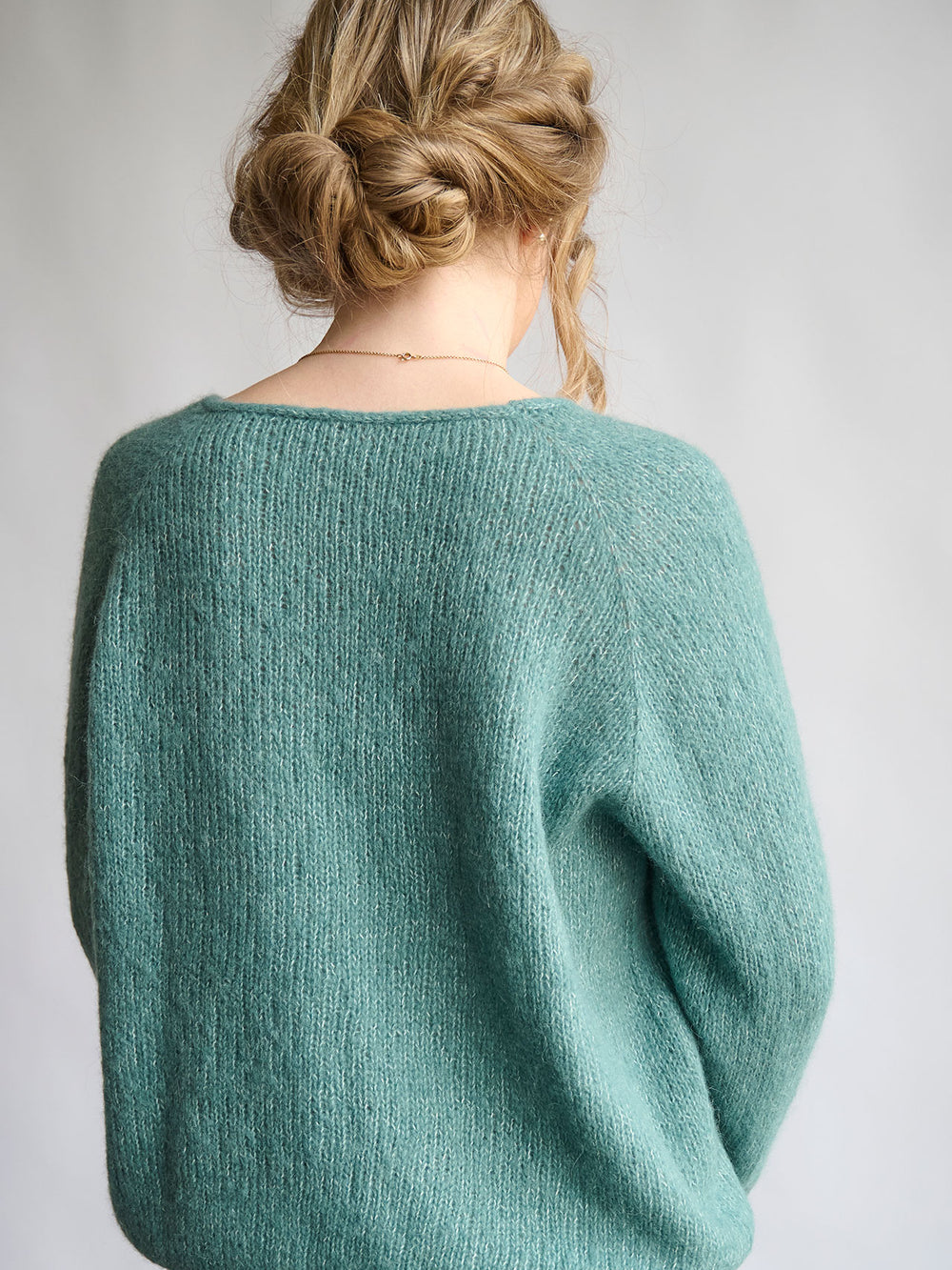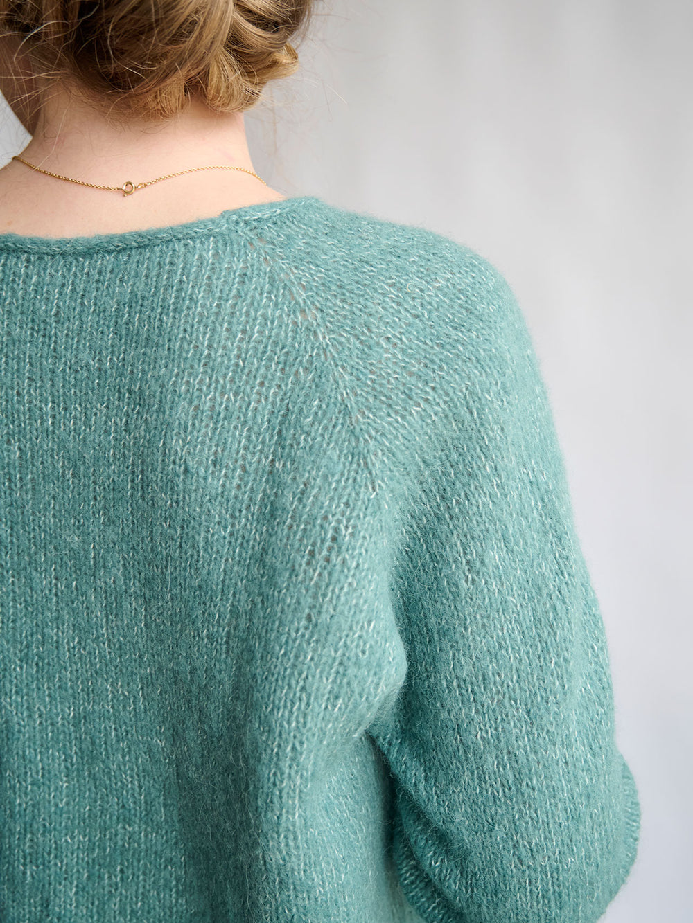 This version is knitted using 1 strand of Mayflower Premium Valentina, which gives the blouse its airy and slightly fluffy appearance. The result is a lightweight and soft garment, thanks to the yarn's blend of alpaca, wool, and cotton.