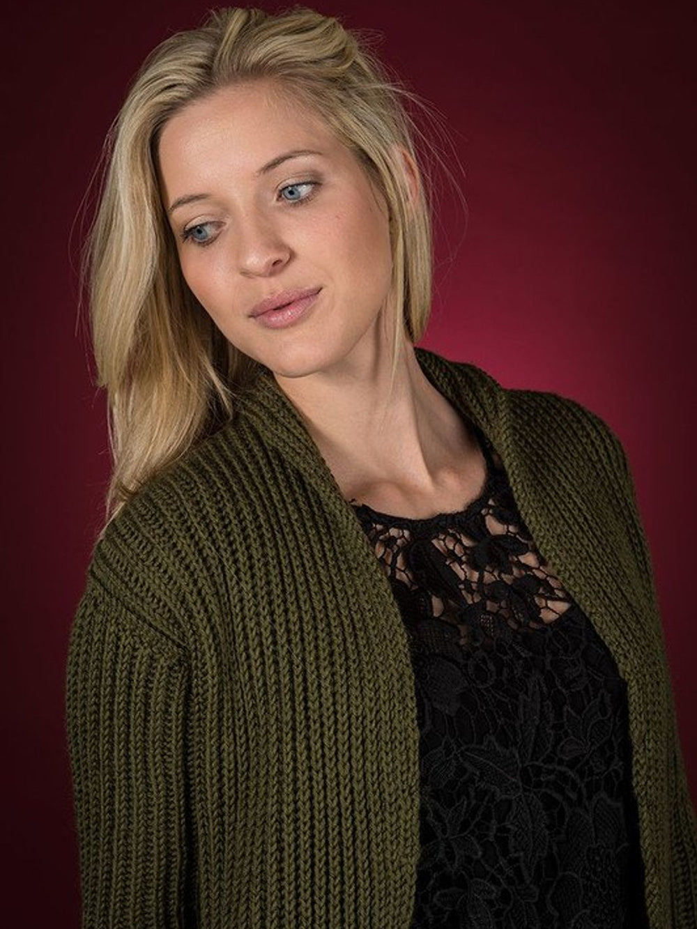 The cardigan itself is knitted in a rib stitch, which gives the knit great elasticity and beautiful structure. Therefore, the finished cardigan also shapes nicely to the body. The cardigan is wonderfully warm because it is knitted in pure wool. At the same time, it is also breathable, so it doesn't feel uncomfortable if you start to get a bit too warm.