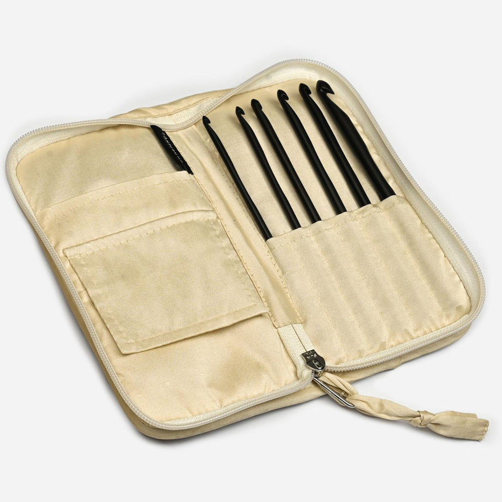 The Radiance crochet hook set comes in a soft case with a zipper, which is made of pure silk. The outside has an embroidered pattern. The case does not take up much space and can easily be carried in a bag when you have crochet hooks in several sizes with you on the go.