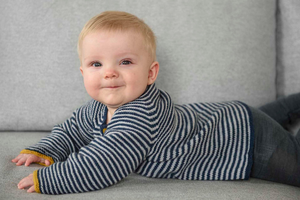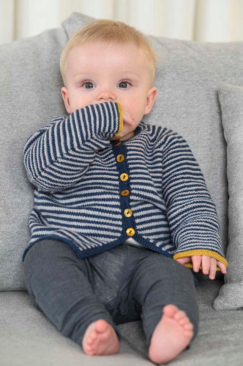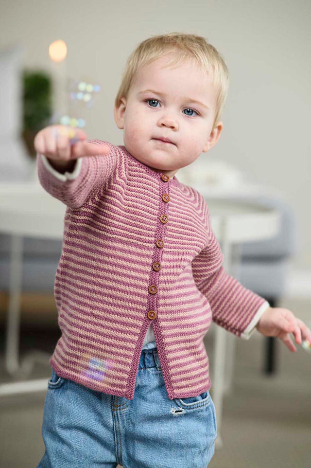Sweet cardigan for children aged 0-4 years. The cardigan has a simple design with narrow stripes and buttons that do not go all the way down.