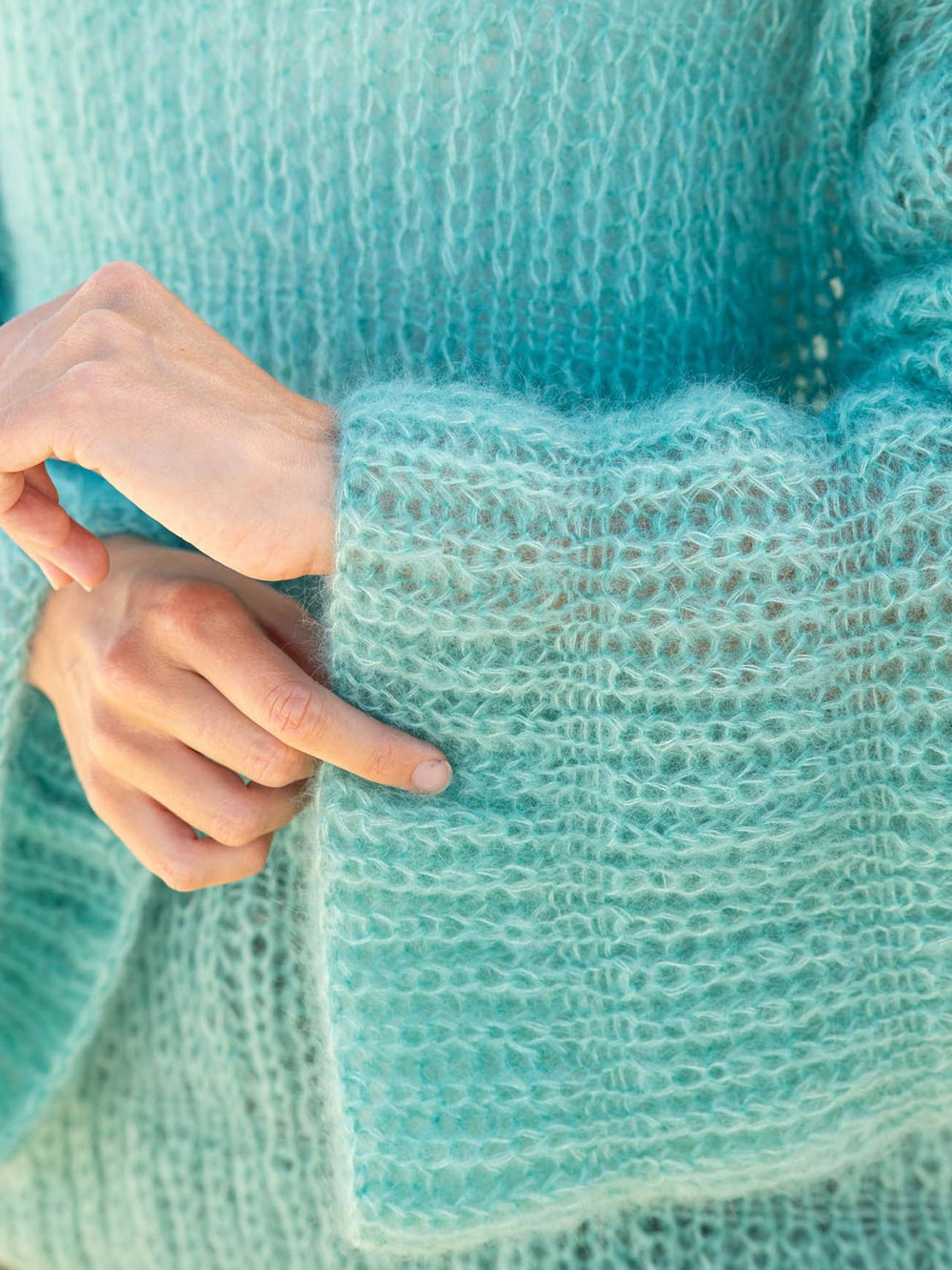 Super Kid Silk is light and soft, which gives the sweater its airy lightness. The width and the wide armholes make the sweater even more airy and comfortable.