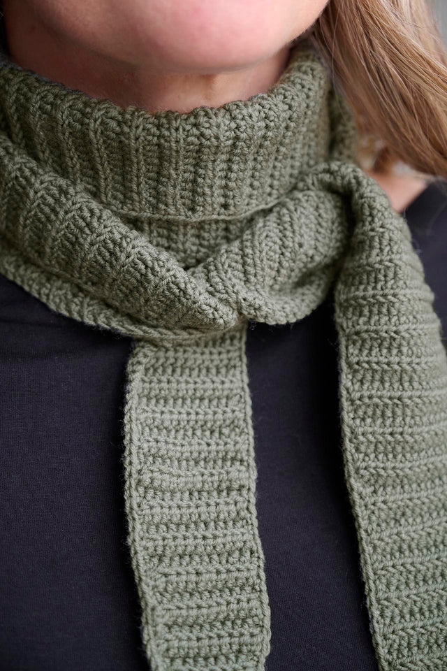The scarf is crocheted in a rib pattern by crocheting half double crochet stitches in the back loop. The pattern includes two different sizes of the scarf, where you can choose how long you want your scarf to be.