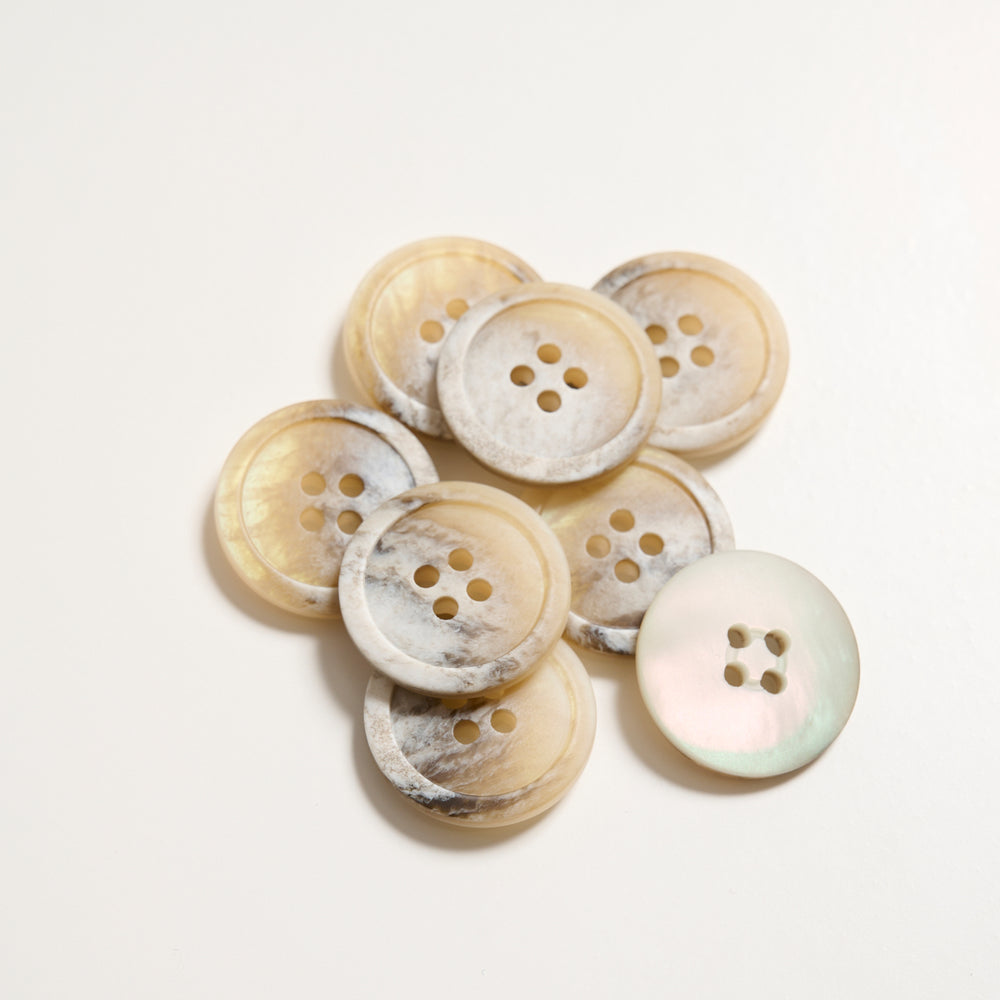 Button with 4 holes in a changing, natural, and shiny design. Sizes: 15mm - 18mm - 20mm. Quantity: 8 pcs.
