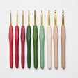 Practical crochet hook set from Mayflower Create featuring 9 different sizes. The hooks come in lovely Christmas colours and have comfortable rubber grips. A great toolset for all crochet enthusiasts. The hooks are made of aluminium and finished with a gold coating.