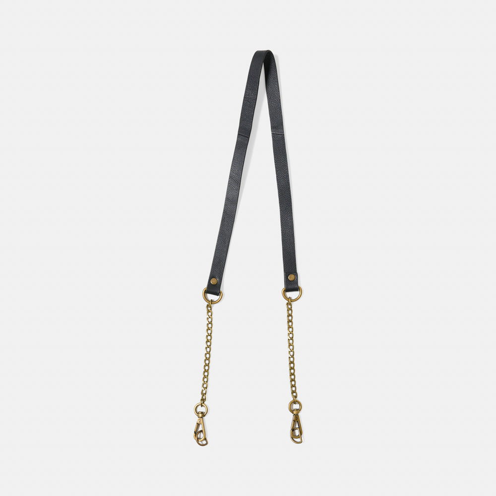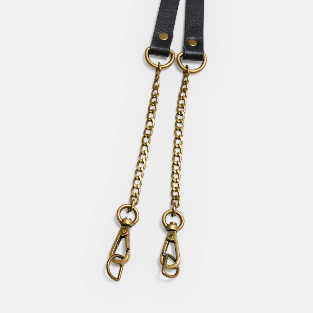 Bag handle, which is handmade and produced in genuine leather with bronze-colored chains and carabiners. The carabiners are attached to the bag with D-rings. The bag handle is 103 cm long (including carabiners), 17 mm wide, and has a thickness of approximately 2 mm. The bag handle is available in either black or brown.