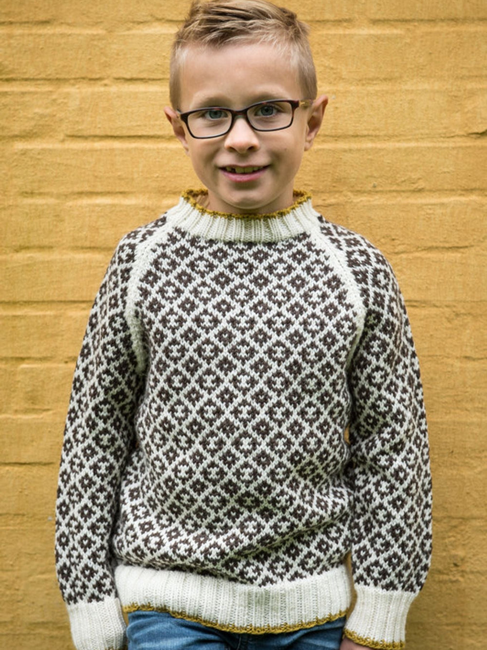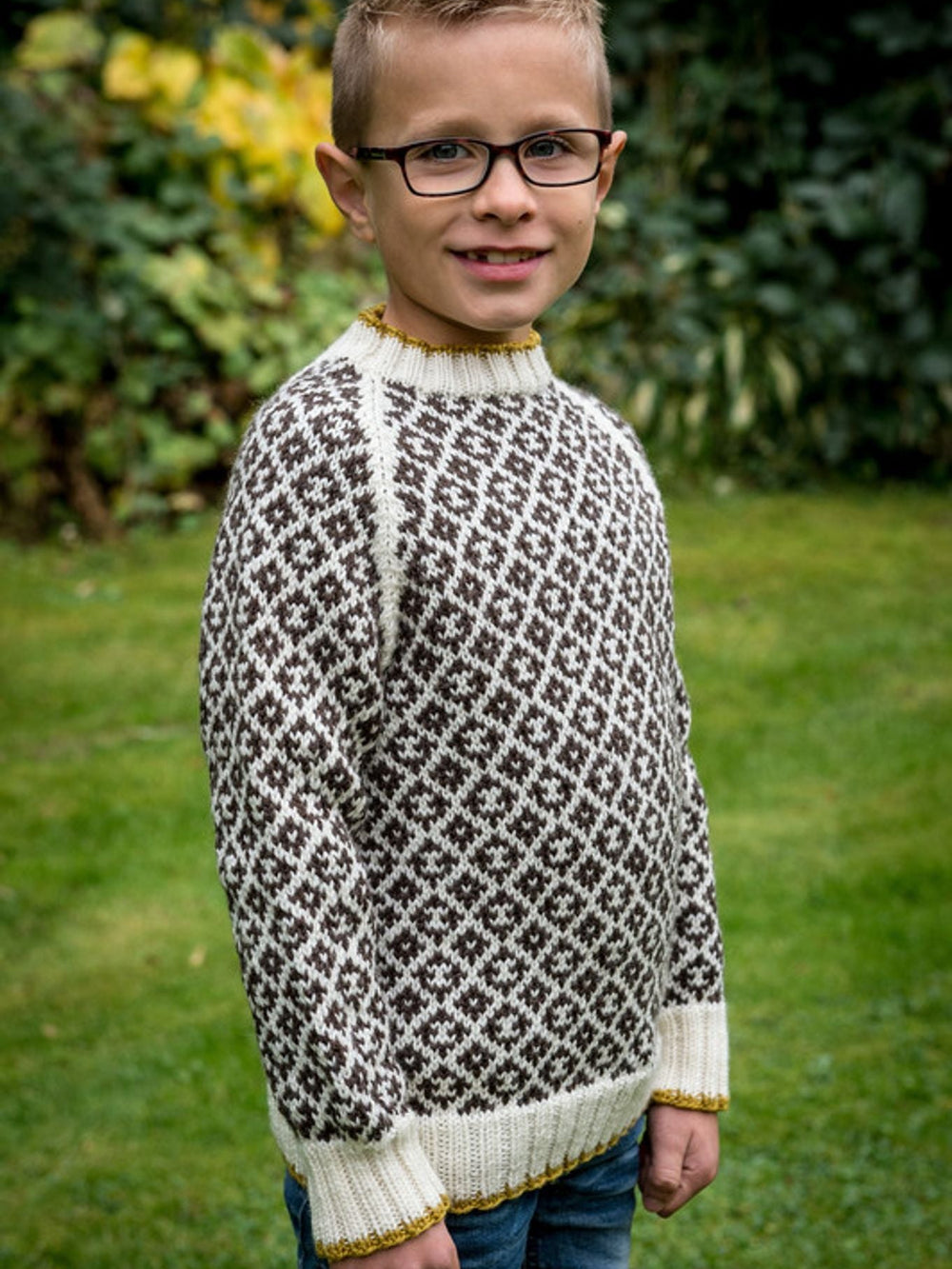 Cool boys' sweater with an all-over pattern on the body and sleeves, reminiscent of Faroese knitting. The sweater features a nice contrast color at the edges of the neck, sleeves, and bottom, and it has a high neck.